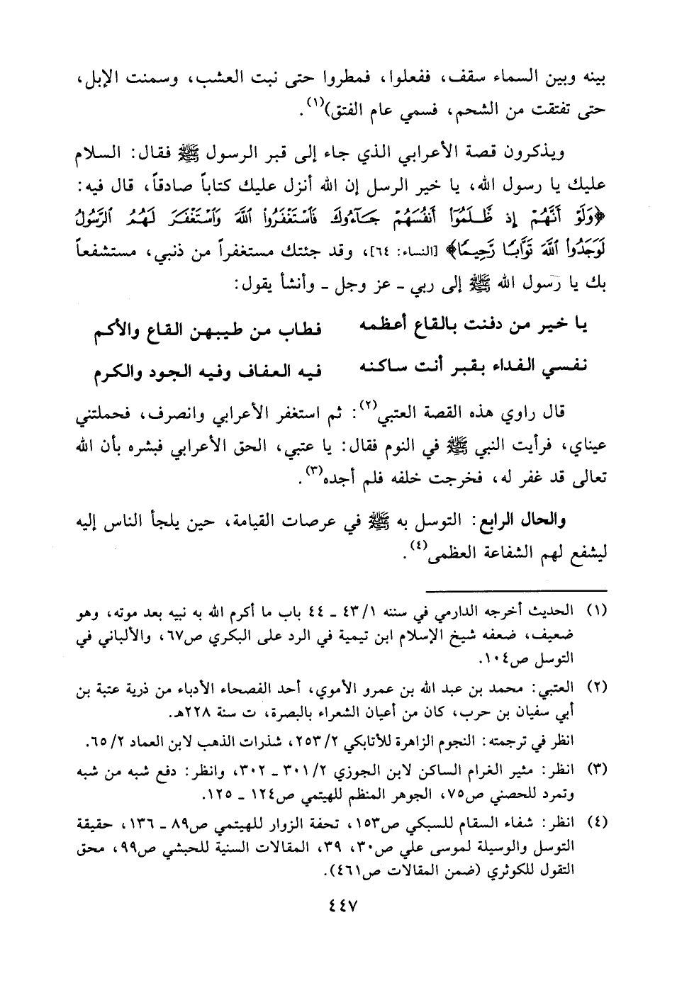 ويذكرون قصة الأعرابي الذي جاء إلى قبر الرسول صلّى الله عليه وسلّم فقال: السلام عليك يا رسول الله، يا خير الرسل إن الله أنزل عليك كتاباً صادقاً، قال فيه: {وَلَوْ أَنَّهُمْ إِذ ظَّلَمُواْ أَنفُسَهُمْ جَآؤُوكَ فَاسْتَغْفَرُواْ اللهَ وَاسْتَغْفَرَ لَهُمُ الرَّسُولُ لَوَجَدُواْ اللهَ تَوَّاباً رَّحِيماً} [النساء: 64] ، وقد جئتك مستغفراً من ذنبي، مستشفعاً بك يا رسول الله صلّى الله عليه وسلّم إلى ربي - عز وجل - وأنشأ يقول:
