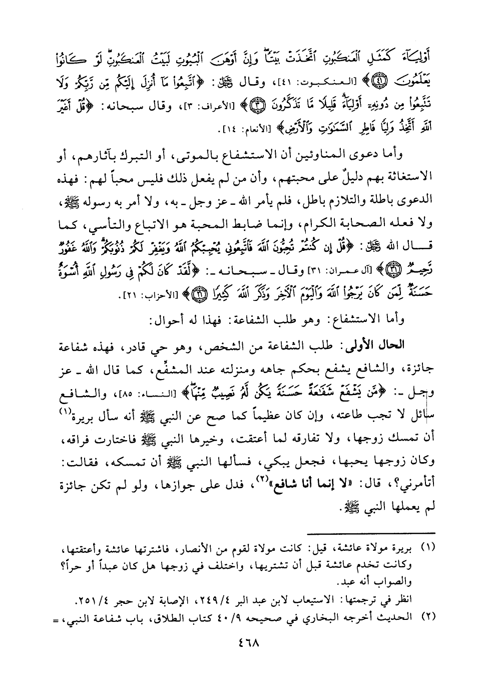 الحال الأولى: طلب الشفاعة من الشخص، وهو حي قادر، فهذه شفاعة جائزة، والشافع يشفع بحكم جاهه ومنزلته عند المشفِّع، كما قال الله - عز وجل -: {مَنْ يَشْفَعْ شَفَاعَةً حَسَنَةً يَكُنْ لَهُ نَصِيبٌ مِنْهَا} [النساء: 85] ، والشافع سائل لا تجب طاعته، وإن كان عظيماً كما صح عن النبي صلّى الله عليه وسلّم أنه سأل بريرة (¬1) أن تمسك زوجها، ولا تفارقه لما أعتقت، وخيرها النبي صلّى الله عليه وسلّم فاختارت فراقه، وكان زوجها يحبها، فجعل يبكي، فسألها النبي صلّى الله عليه وسلّم أن تمسكه، فقالت: أتأمرني؟، قال: «لا إنما أنا شافع» (¬2) ، فدل على جوازها، ولو لم تكن جائزة لم يعملها النبي صلّى الله عليه وسلّم.