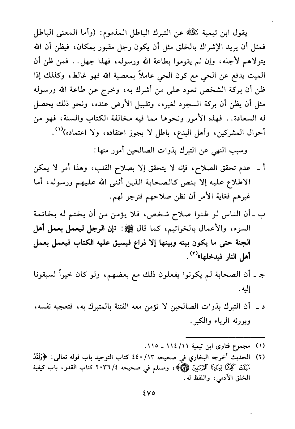 يقول ابن تيمية رحمه الله عن التبرك الباطل المذموم: (وأما المعنى الباطل فمثل أن يريد الإشراك بالخلق مثل أن يكون رجل مقبور بمكان، فيظن أن الله يتولاهم لأجله، وإن لم يقوموا بطاعة الله ورسوله، فهذا جهل.. فمن ظن أن الميت يدفع عن الحي مع كون الحي عاملاً بمعصية الله فهو غالط، وكذلك إذا ظن أن بركة الشخص تعود على من أشرك به، وخرج عن طاعة الله ورسوله مثل أن يظن أن بركة السجود لغيره، وتقبيل الأرض عنده، ونحو ذلك يحصل له السعادة.. فهذه الأمور ونحوها مما فيه مخالفة الكتاب والسنة، فهو من أحوال المشركين، وأهل البدع، باطل لا يجوز اعتقاده، ولا اعتماده) (¬1) .
