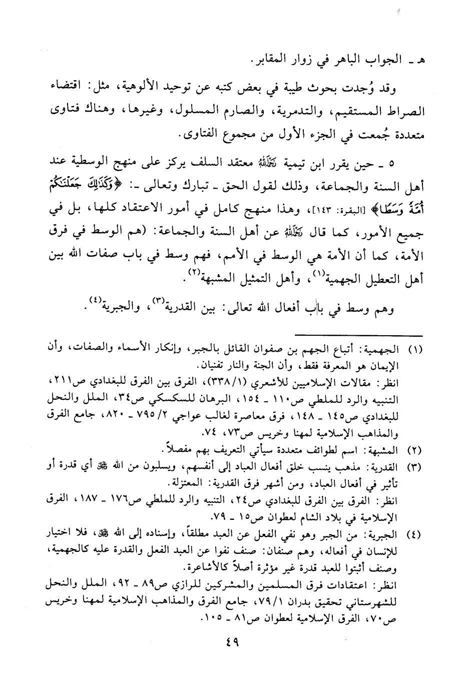 5 - حين يقرر ابن تيمية رحمه الله معتقد السلف يركز على منهج الوسطية عند أهل السنة والجماعة، وذلك لقول الحق - تبارك وتعالى -: {وَكَذَلِكَ جَعَلْنَاكُمْ أُمَّةً وَسَطاً} [البقرة: 143] ، وهذا منهج كامل في أمور الاعتقاد كلها، بل في جميع الأمور، كما قال رحمه الله عن أهل السنة والجماعة: (هم الوسط في فرق الأمة، كما أن الأمة هي الوسط في الأمم، فهم وسط في باب صفات الله بين أهل التعطيل الجهمية (¬1) ، وأهل التمثيل المشبهة (¬2) .