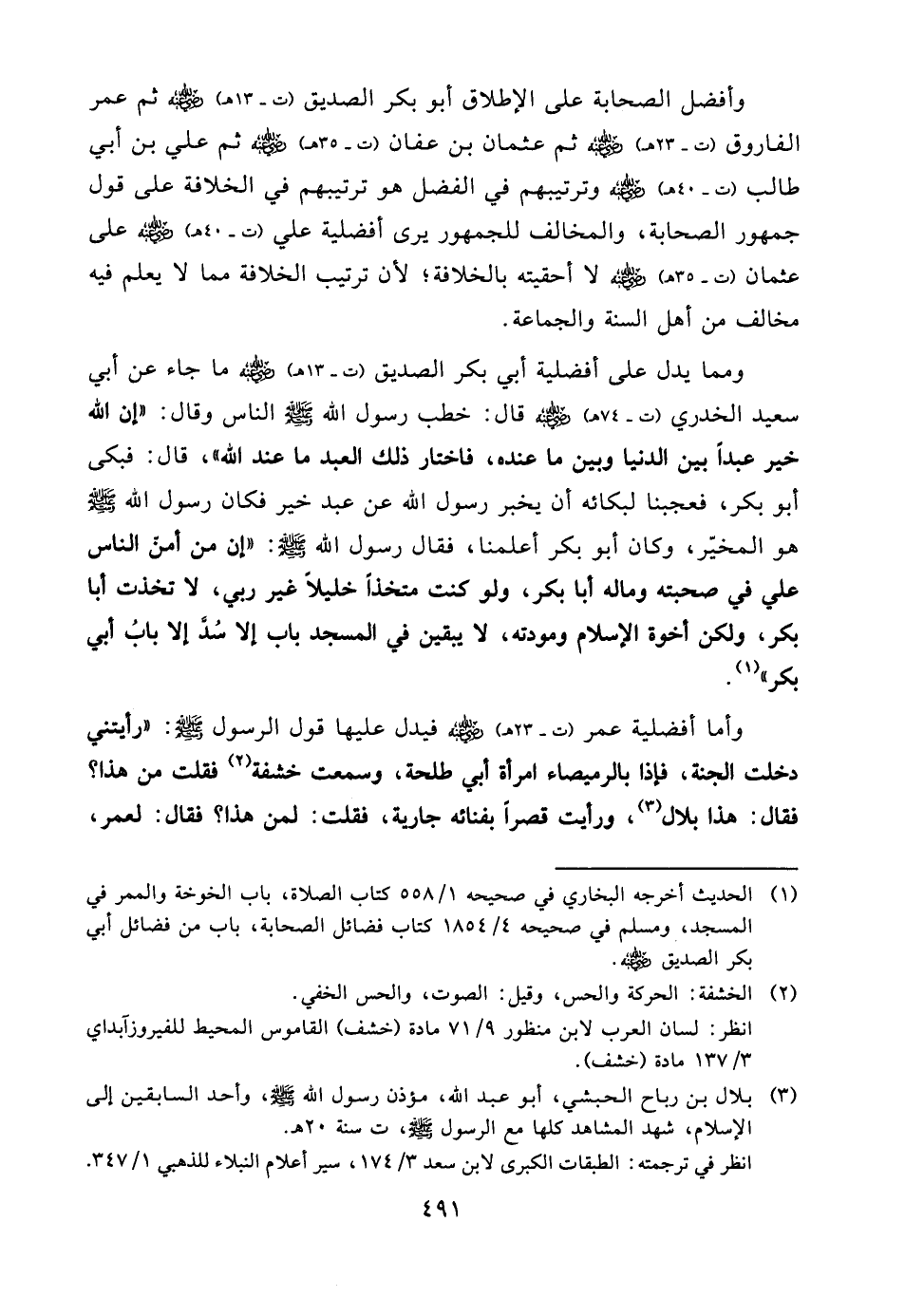 وأما أفضلية عمر (ت - 23هـ) رضي الله عنه فيدل عليها قول الرسول صلّى الله عليه وسلّم: «رأيتني دخلت الجنة، فإذا بالرميصاء امرأة أبي طلحة، وسمعت خشفة (¬2) فقلت من هذا؟ فقال: هذا بلال (¬3) ،