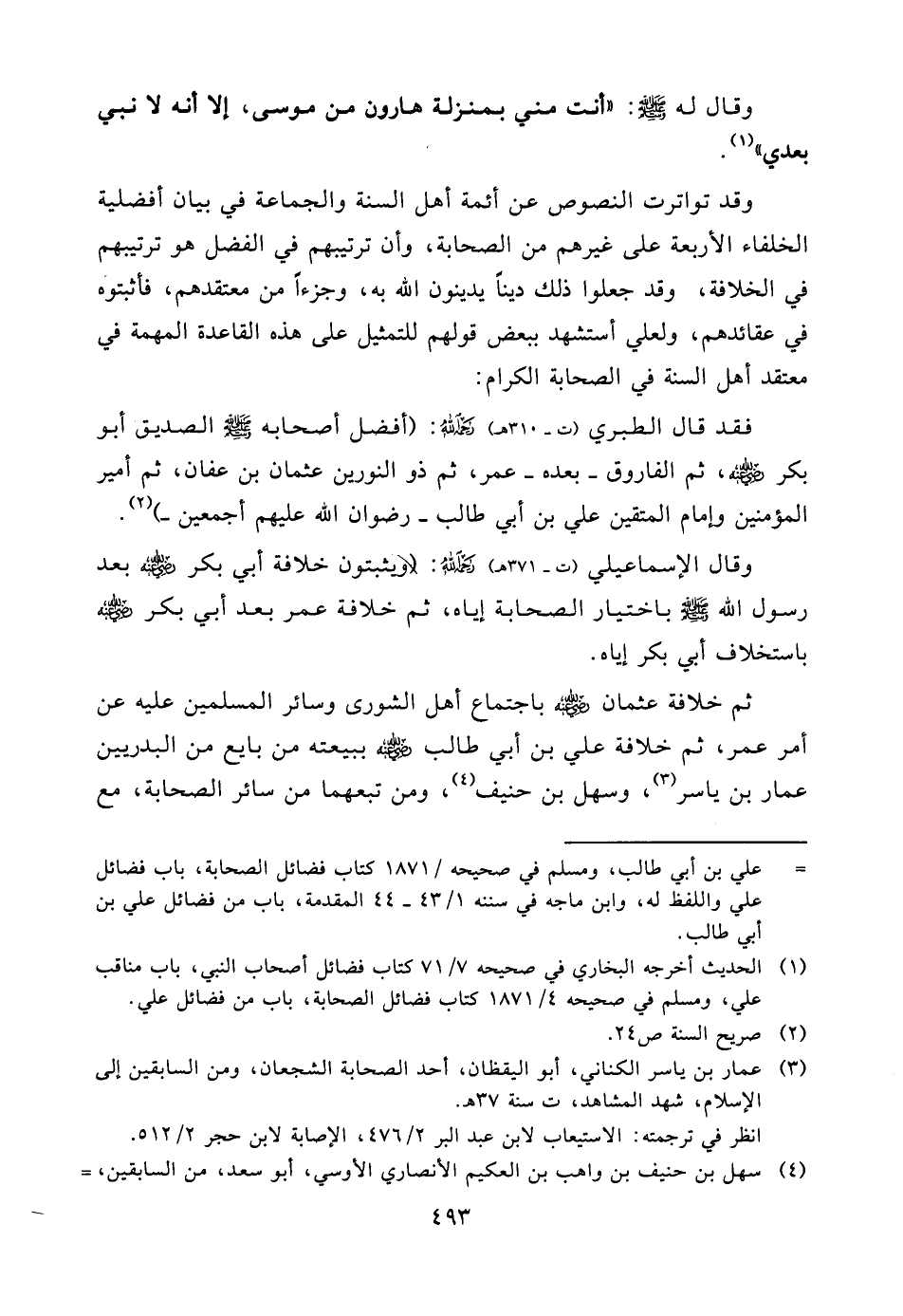 فقد قال الطبري (ت - 310هـ) رحمه الله: (أفضل أصحابه صلّى الله عليه وسلّم الصديق أبو بكر رضي الله عنه، ثم الفاروق - بعده - عمر، ثم ذو النورين عثمان بن عفان، ثم أمير المؤمنين وإمام المتقين علي بن أبي طالب - رضوان الله عليهم أجمعين -) (¬2) .