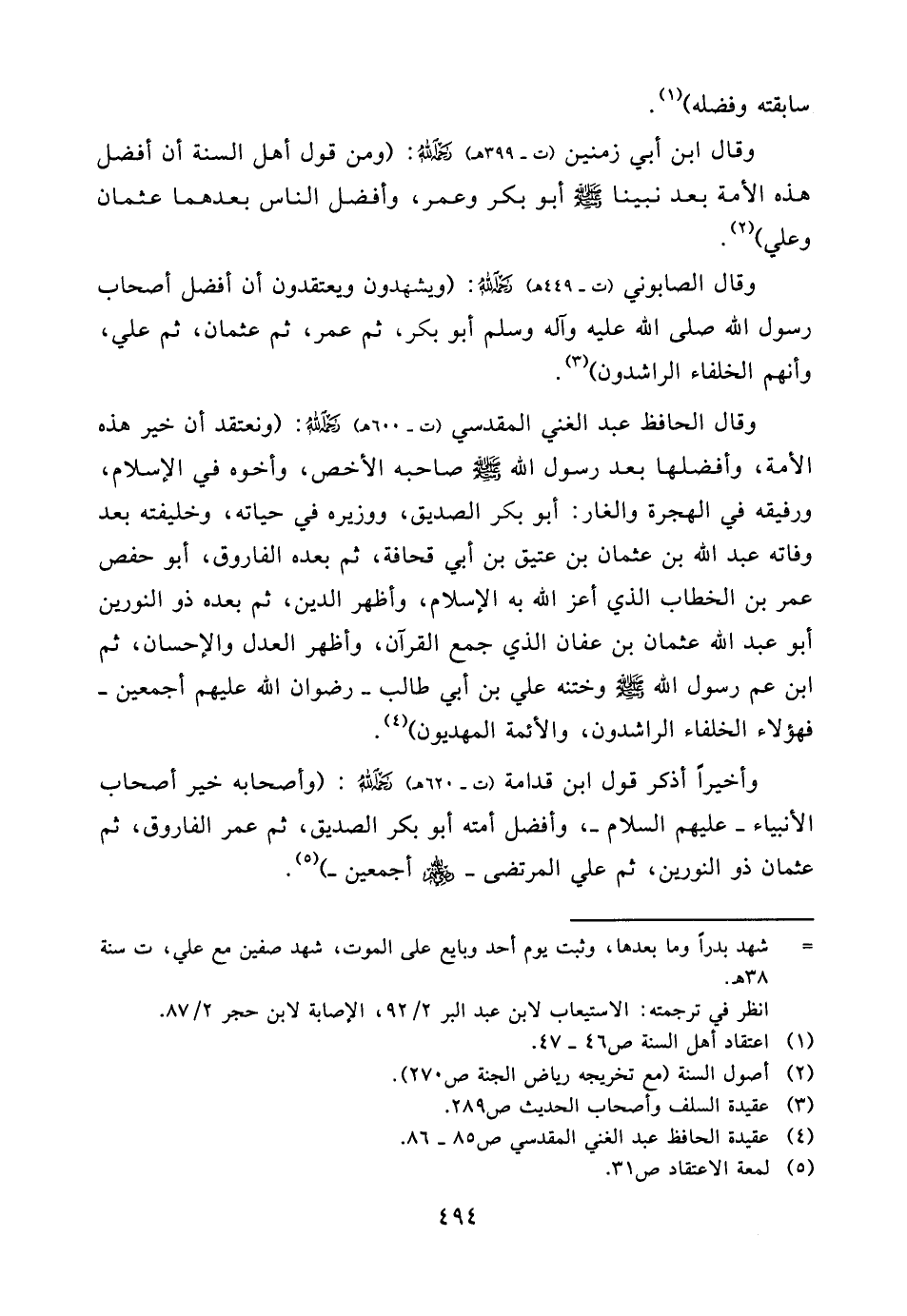 وأخيراً أذكر قول ابن قدامة (ت - 620هـ) رحمه الله: (وأصحابه خير أصحاب الأنبياء - عليهم السلام -، وأفضل أمته أبو بكر الصديق، ثم عمر الفاروق، ثم عثمان ذو النورين، ثم علي المرتضى - رضي الله عنهم أجمعين -) (¬5) .