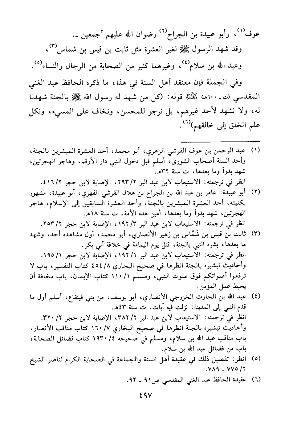 وفي الجملة فإن معتقد أهل السنة في هذا، ما ذكره الحافظ عبد الغني المقدسي (ت - 600هـ) رحمه الله قوله: (كل من شهد له رسول الله صلّى الله عليه وسلّم بالجنة شهدنا له، ولا نشهد لأحد غيرهم، بل نرجو للمحسن، ونخاف على المسيء، ونكل علم الخلق إلى خالقهم) (¬6) .