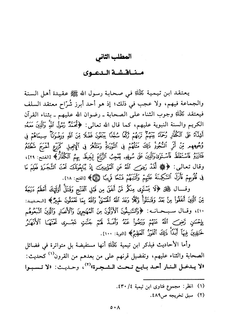 وأما الأحاديث فيذكر ابن تيمية رحمه الله أنها مستفيضة بل متواترة في فضائل الصحابة والثناء عليهم، وتفضيل قرنهم على من بعدهم من القرون (¬1) كحديث: «لا يدخل النار أحد بايع تحت الشجرة» ، وحديث: «لا تسبوا
