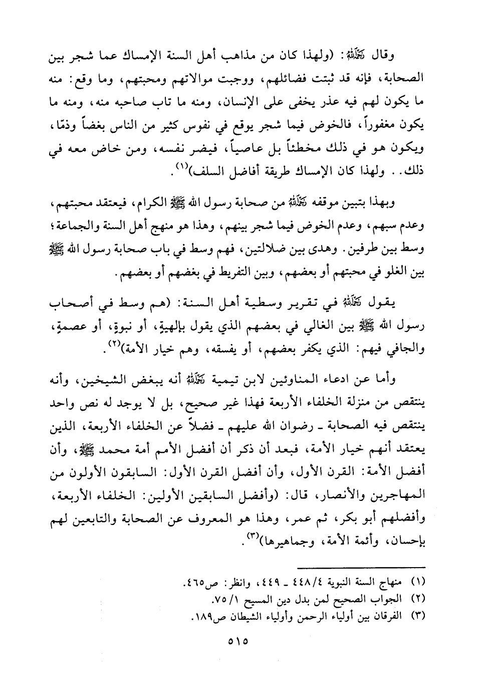 يقول رحمه الله في تقرير وسطية أهل السنة: (هم وسط في أصحاب رسول الله صلّى الله عليه وسلّم بين الغالي في بعضهم الذي يقول بإلهيةٍ، أو نبوةٍ، أو عصمةٍ، والجافي فيهم: الذي يكفر بعضهم، أو يفسقه، وهم خيار الأمة) (¬2) .