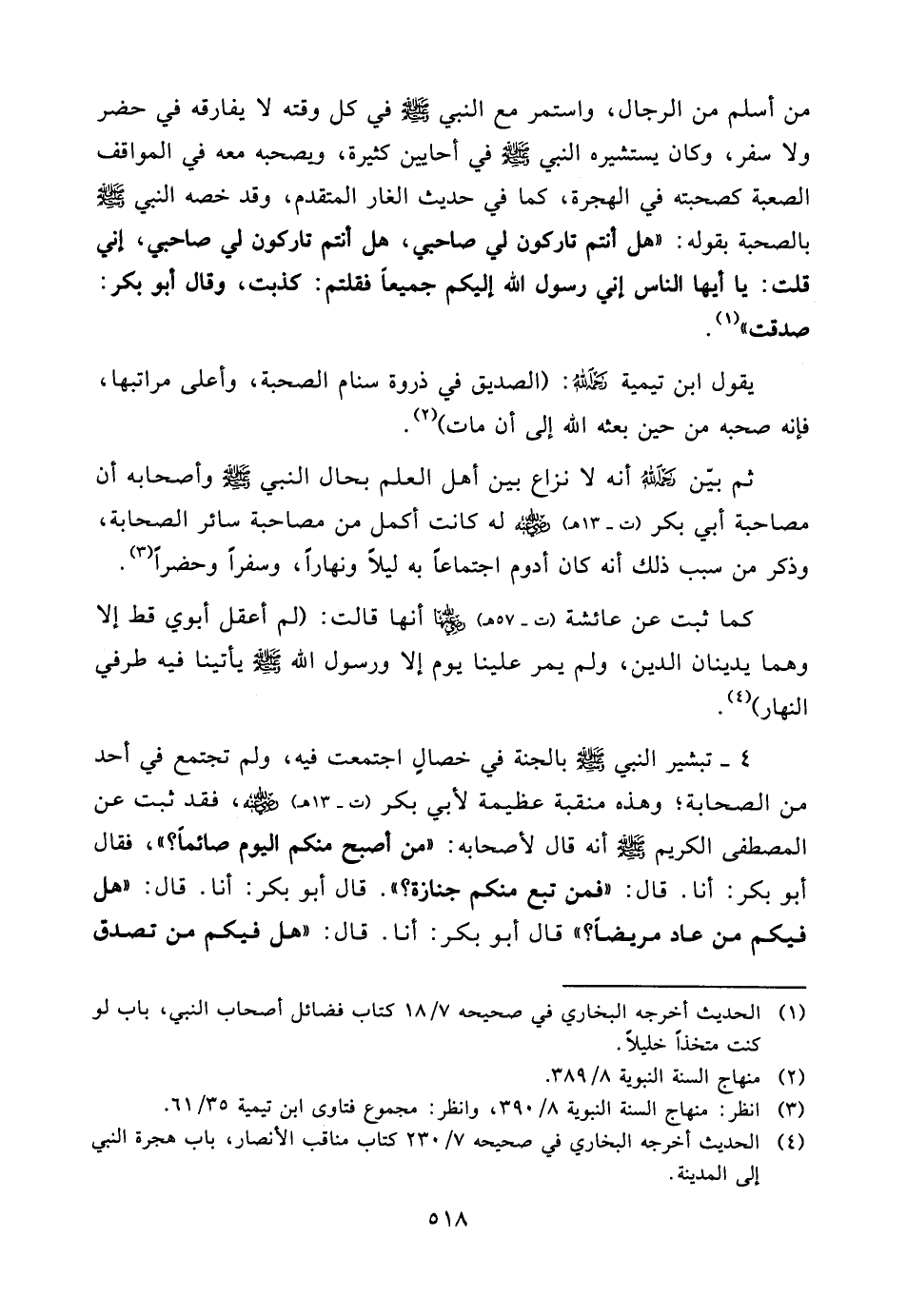 ثم بيّن رحمه الله أنه لا نزاع بين أهل العلم بحال النبي صلّى الله عليه وسلّم وأصحابه أن مصاحبة أبي بكر (ت - 13هـ) رضي الله عنه له كانت أكمل من مصاحبة سائر الصحابة، وذكر من سبب ذلك أنه كان أدوم اجتماعاً به ليلاً ونهاراً، وسفراً وحضراً (¬3) .