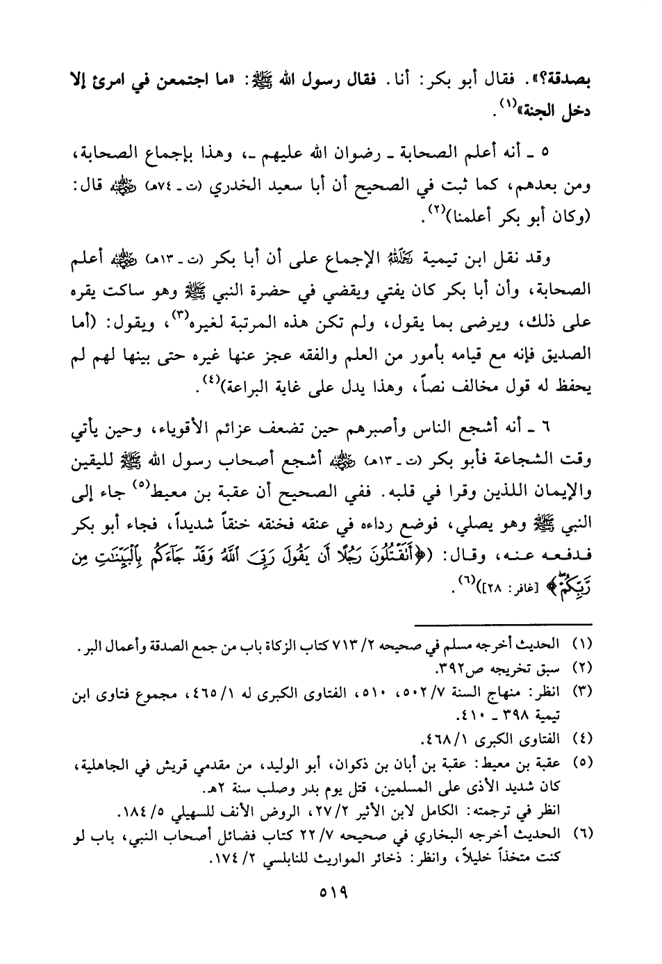 5 - أنه أعلم الصحابة - رضوان الله عليهم -، وهذا بإجماع الصحابة، ومن بعدهم، كما ثبت في الصحيح أن أبا سعيد الخدري (ت - 74هـ) رضي الله عنه قال: (وكان أبو بكر أعلمنا) (¬2) .
