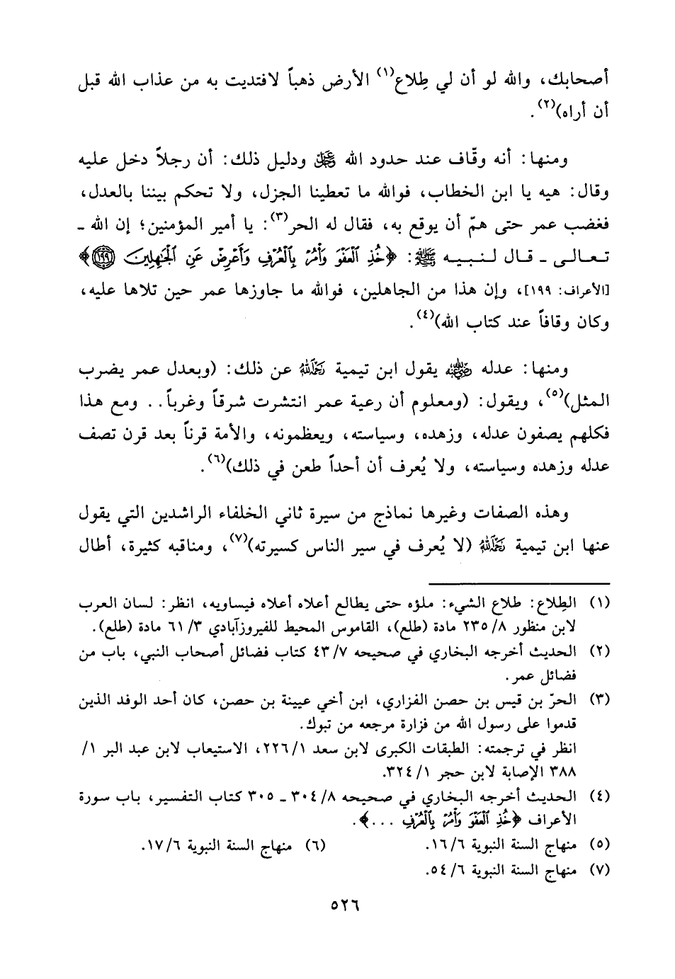 يا أمير المؤمنين؛ إن الله - تعالى - قال لنبيه صلّى الله عليه وسلّم: {خُذِ الْعَفْوَ وَأْمُرْ بِالْعُرْفِ وَأَعْرِضْ عَنِ الْجَاهِلِينَ} [الأعراف: 199] ، وإن هذا من الجاهلين، فوالله ما جاوزها عمر حين تلاها عليه، وكان وقافاً عند كتاب الله) (¬4) .