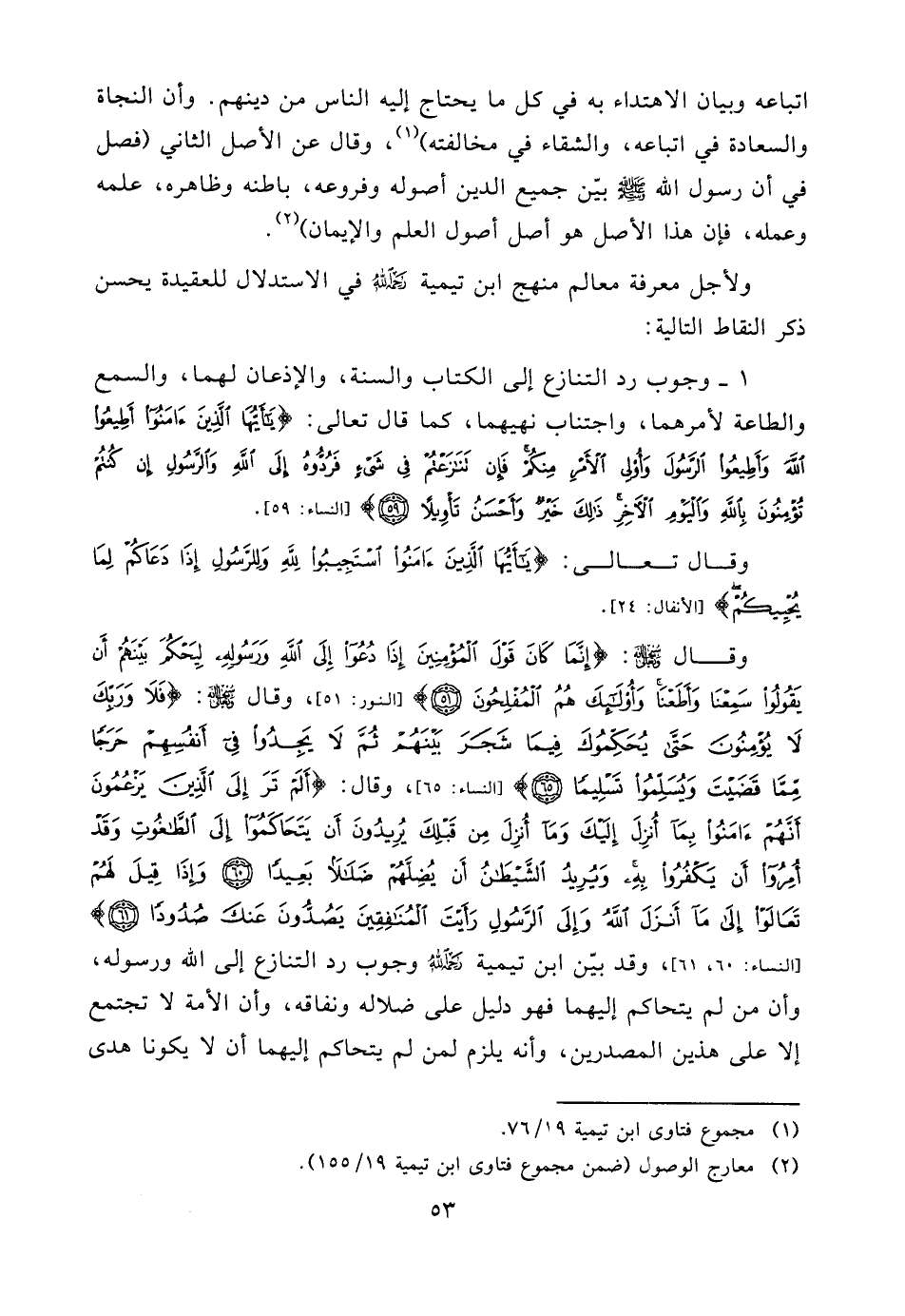 وقال سبحانه وتعالى: {إِنَّمَا كَانَ قَوْلَ الْمُؤْمِنِينَ إِذَا دُعُوا إِلَى اللَّهِ وَرَسُولِهِ لِيَحْكُمَ بَيْنَهُمْ أَنْ يَقُولُوا سَمِعْنَا وَأَطَعْنَا وَأُولَئِكَ هُمُ الْمُفْلِحُونَ} [النور: 51] ، وقال سبحانه وتعالى: {فَلا وَرَبِّكَ لا يُؤْمِنُونَ حَتَّى يُحَكِّمُوكَ فِيمَا شَجَرَ بَيْنَهُمْ ثُمَّ لا يَجِدُوا فِي أَنْفُسِهِمْ حَرَجاً مِمَّا قَضَيْتَ وَيُسَلِّمُوا تَسْلِيماً} [النساء: 65] ، وقال: {بِمَا أُنْزِلَ إِلَيْكَ وَمَا أُنْزِلَ مِنْ قَبْلِكَ يُرِيدُونَ أَنْ يَتَحَاكَمُوا إِلَى الطَّاغُوتِ وَقَدْ أُمِرُوا أَنْ يَكْفُرُوا بِهِ وَيُرِيدُ الشَّيْطَانُ أَنْ يُضِلَّهُمْ ضَلالاً بَعِيداً * وَإِذَا قِيلَ لَهُمْ تَعَالَوْا إِلَى مَا أَنْزَلَ اللَّهُ وَإِلَى الرَّسُولِ رَأَيْتَ الْمُنَافِقِينَ يَصُدُّونَ عَنْكَ صُدُوداً} [النساء: 60، 61] ، وقد بيّن ابن تيمية رحمه الله وجوب رد التنازع إلى الله ورسوله، وأن من لم يتحاكم إليهما فهو دليل على ضلاله ونفاقه، وأن الأمة لا تجتمع إلا على هذين المصدرين، وأنه يلزم لمن لم يتحاكم إليهما أن لا يكونا هدى