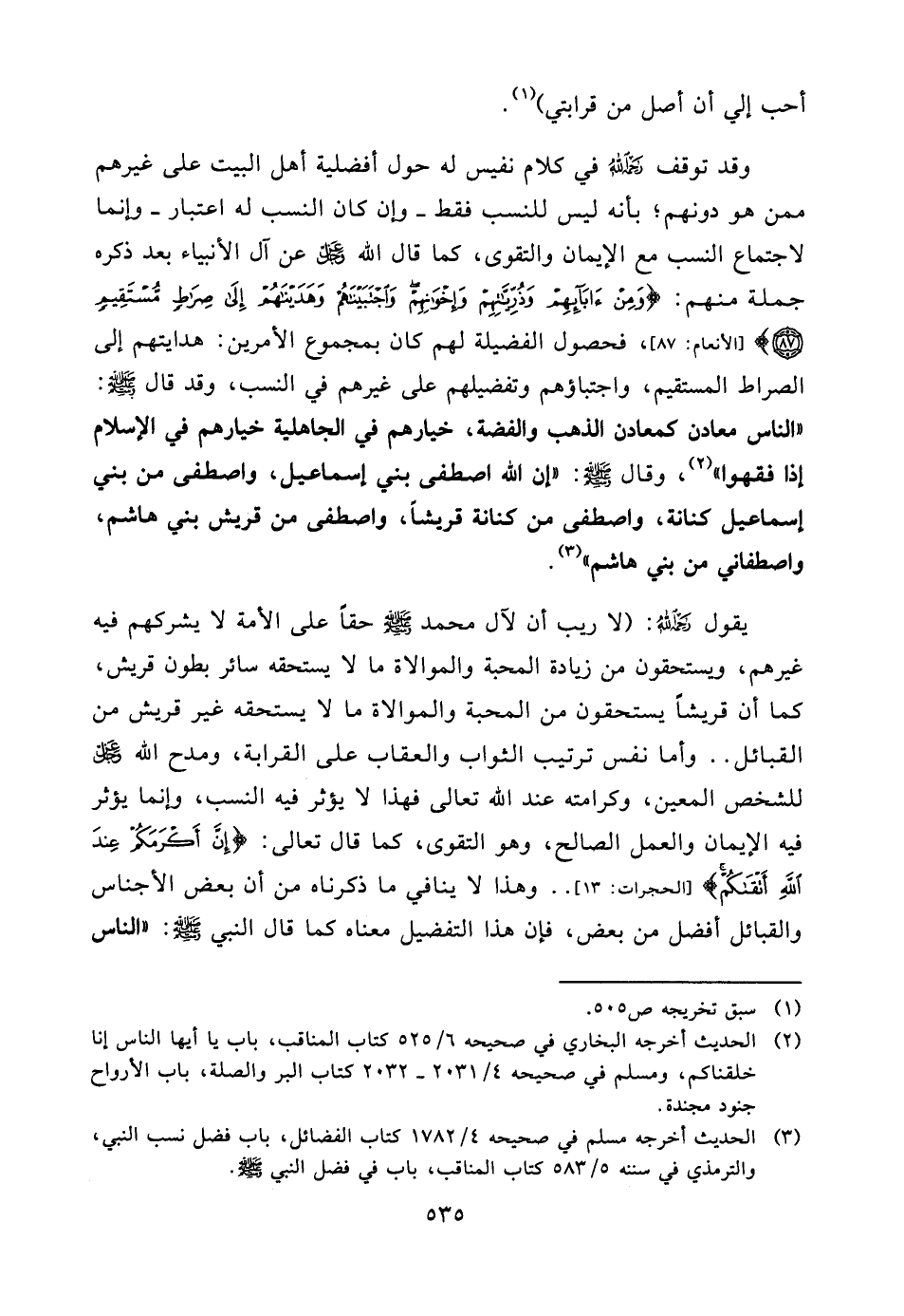 (¬3) الحديث أخرجه مسلم في صحيحه 4/1782 كتاب الفضائل، باب فضل نسب النبي، والترمذي في سننه 5/583 كتاب المناقب، باب في فضل النبي صلّى الله عليه وسلّم.