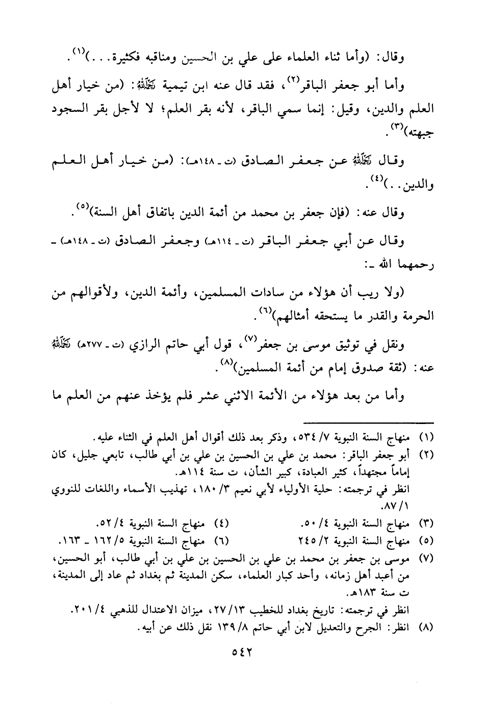وأما أبو جعفر الباقر (¬2) ، فقد قال عنه ابن تيمية رحمه الله: (من خيار أهل العلم والدين، وقيل: إنما سمي الباقر، لأنه بقر العلم؛ لا لأجل بقر السجود جبهته) (¬3) .
