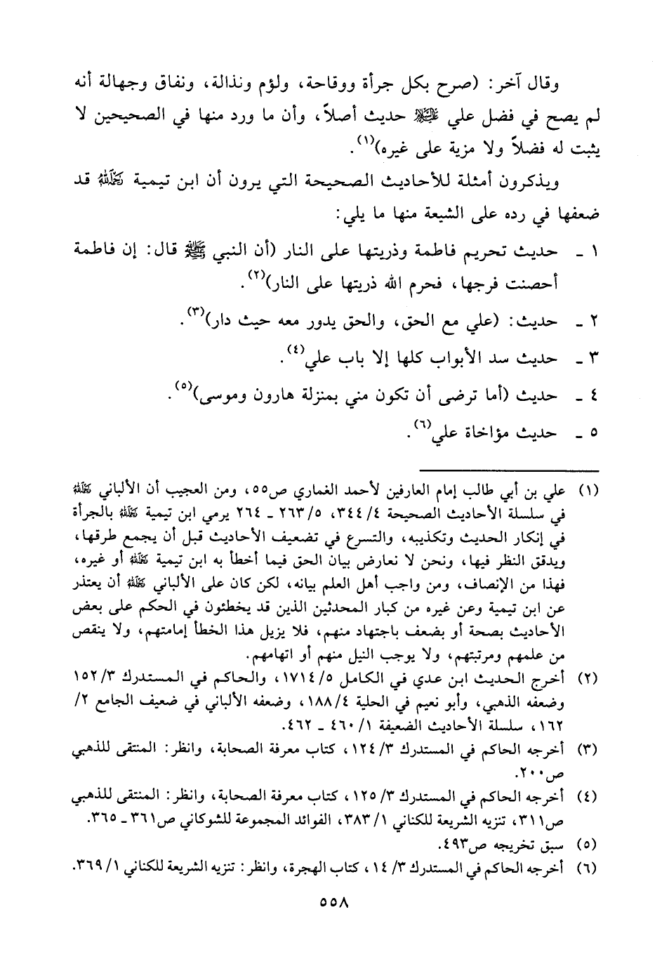(¬1) علي بن أبي طالب إمام العارفين لأحمد الغماري ص55، ومن العجيب أن الألباني رحمه الله في سلسلة الأحاديث الصحيحة 4/344، 5/263 - 264 يرمي ابن تيمية رحمه الله بالجرأة في إنكار الحديث وتكذيبه، والتسرع في تضعيف الأحاديث قبل أن يجمع طرقها، ويدقق النظر فيها، ونحن لا نعارض بيان الحق فيما أخطأ به ابن تيمية رحمه الله أو غيره، فهذا من الإنصاف، ومن واجب أهل العلم بيانه، لكن كان على الألباني رحمه الله أن يعتذر عن ابن تيمية وعن غيره من كبار المحدثين الذين قد يخطئون في الحكم على بعض الأحاديث بصحة أو بضعف باجتهاد منهم، فلا يزيل هذا الخطأ إمامتهم، ولا ينقص من علمهم ومرتبتهم، ولا يوجب النيل منهم أو اتهامهم.