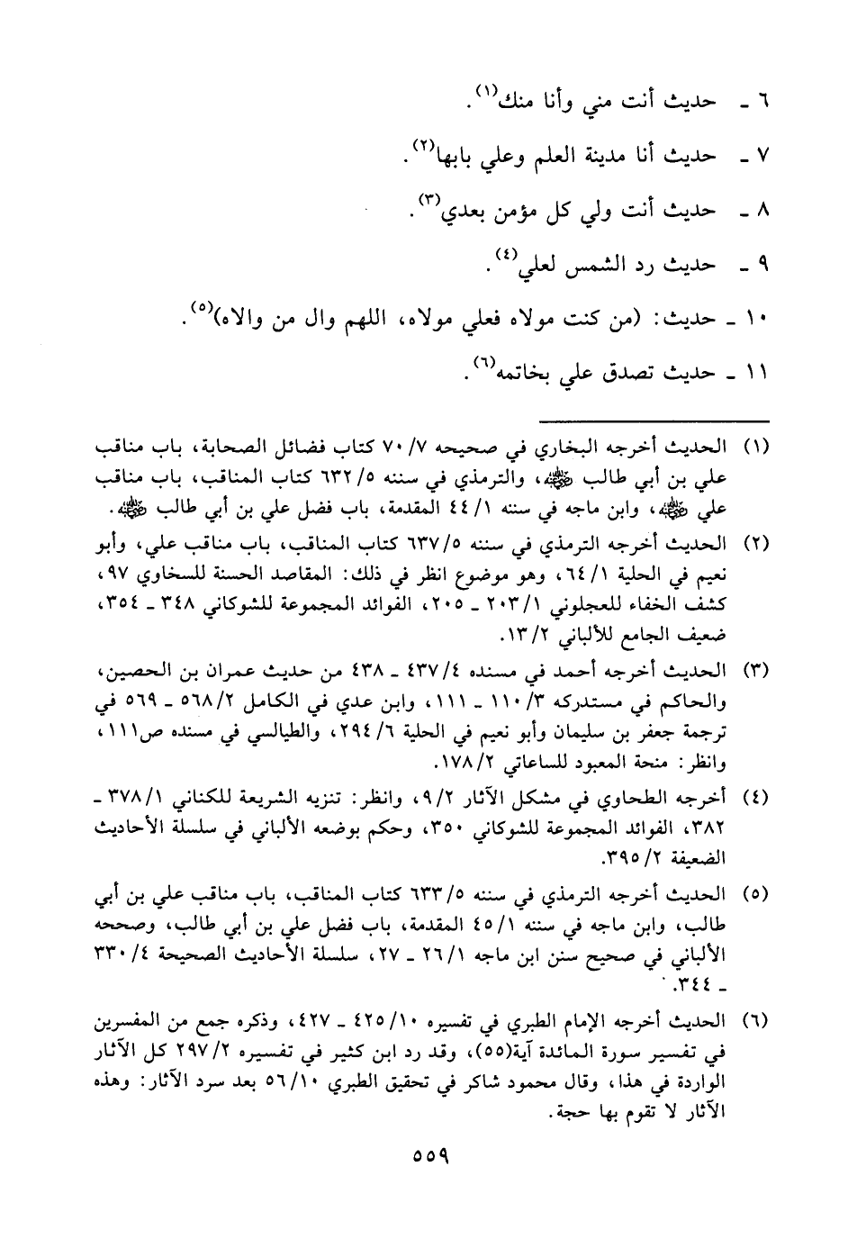 (¬5) الحديث أخرجه الترمذي في سننه 5/633 كتاب المناقب، باب مناقب علي بن أبي طالب، وابن ماجه في سننه 1/45 المقدمة، باب فضل علي بن أبي طالب، وصححه الألباني في صحيح سنن ابن ماجه 1/26 - 27، سلسلة الأحاديث الصحيحة 4/330 - 344.