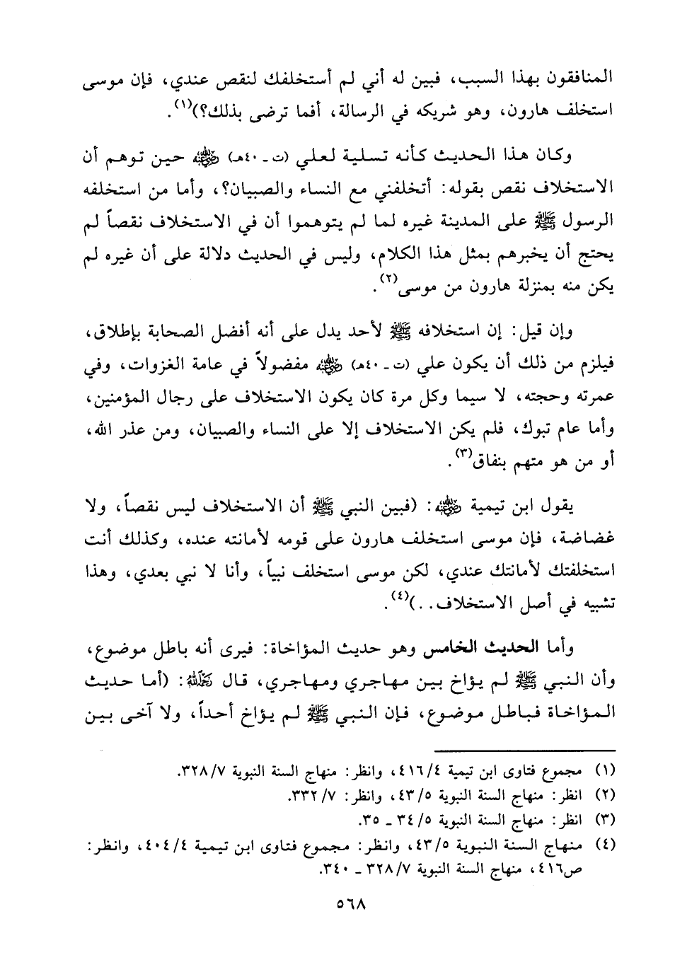 (¬4) منهاج السنة النبوية 5/43، وانظر: مجموع فتاوى ابن تيمية 4/404، وانظر: ص416، منهاج السنة النبوية 7/328 - 340.