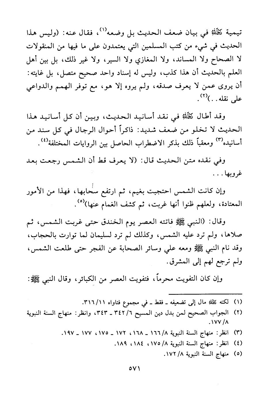وقال: (النبي صلّى الله عليه وسلّم فاتته العصر يوم الخندق حتى غربت الشمس، ثم صلاها، ولم ترد عليه الشمس، وكذلك لم ترد لسليمان لما توارت بالحجاب، وقد نام النبي صلّى الله عليه وسلّم ومعه علي وسائر الصحابة عن الفجر حتى طلعت الشمس، ولم ترجع لهم إلى المشرق.