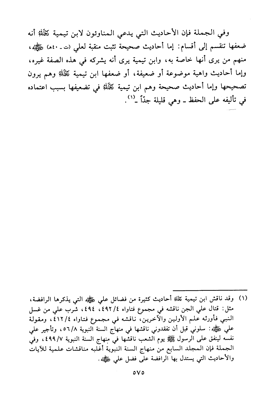 (¬1) وقد ناقش ابن تيمية رحمه الله أحاديث كثيرة من فضائل علي رضي الله عنه التي يذكرها الرافضة، مثل: قتال علي الجن ناقشه في مجموع فتاواه 4/492، 494، شرب علي من غسل النبي فأورثه علم الأولين والآخرين، ناقشه في مجموع فتاواه 4/412، ومقولة علي رضي الله عنه: سلوني قبل أن تفقدوني ناقشها في منهاج السنة النبوية 8/56، وتأجير علي نفسه لينفق على الرسول صلّى الله عليه وسلّم يوم الشعب ناقشها في منهاج السنة النبوية 7/499، وفي الجملة فإن المجلد السابع من منهاج السنة النبوية أغلبه مناقشات علمية للآيات والأحاديث التي يستدل بها الرافضة على فضل علي رضي الله عنه.