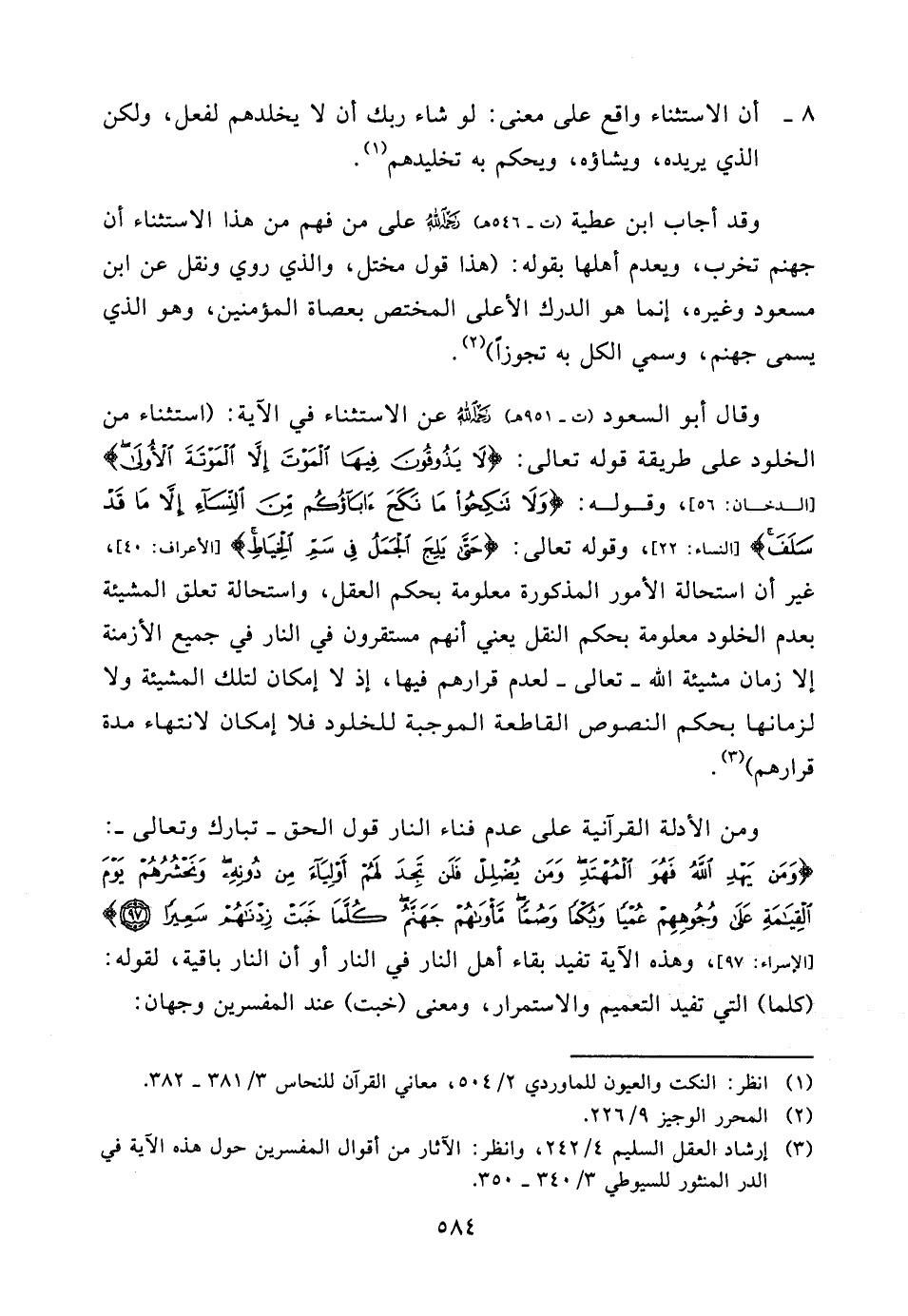وقال أبو السعود (ت - 951هـ) رحمه الله عن الاستثناء في الآية: (استثناء من الخلود على طريقة قوله تعالى: {لَا يَذُوقُونَ فِيهَا الْمَوْتَ إِلَّا الْمَوْتَةَ الْأُولَى} [الدخان: 56] ، وقوله: {وَلاَ تَنكِحُواْ مَا نَكَحَ آبَاؤُكُم مِّنَ النِّسَاء إِلاَّ مَا قَدْ سَلَفَ} [النساء: 22] ، وقوله تعالى: {حَتَّى يَلِجَ الْجَمَلُ فِي سَمِّ الْخِيَاطِ} [الأعراف: 40] ، غير أن استحالة الأمور المذكورة معلومة بحكم العقل، واستحالة تعلق المشيئة بعدم الخلود معلومة بحكم النقل يعني أنهم مستقرون في النار في جميع الأزمنة إلا زمان مشيئة الله - تعالى - لعدم قرارهم فيها، إذ لا إمكان لتلك المشيئة ولا لزمانها بحكم النصوص القاطعة الموجبة للخلود فلا إمكان لانتهاء مدة قرارهم) (¬3) .