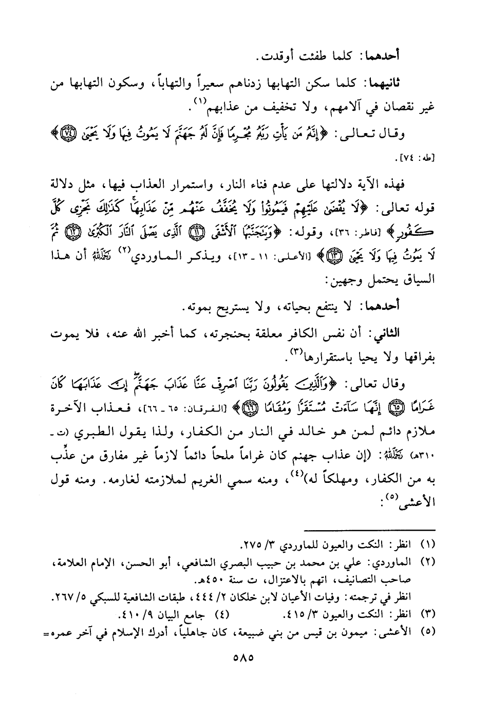 فهذه الآية دلالتها على عدم فناء النار، واستمرار العذاب فيها، مثل دلالة قوله تعالى: {لَا يُقْضَى عَلَيْهِمْ فَيَمُوتُوا وَلَا يُخَفَّفُ عَنْهُم مِّنْ عَذَابِهَا كَذَلِكَ نَجْزِي كُلَّ كَفُورٍ} [فاطر: 36] ، وقوله: {وَيَتَجَنَّبُهَا الْأَشْقَى * الَّذِي يَصْلَى النَّارَ الْكُبْرَى * ثُمَّ لَا يَمُوتُ فِيهَا وَلَا يَحْيَى} [الأعلى: 11 - 13] ، ويذكر الماوردي (¬2) رحمه الله أن هذا السياق يحتمل وجهين: