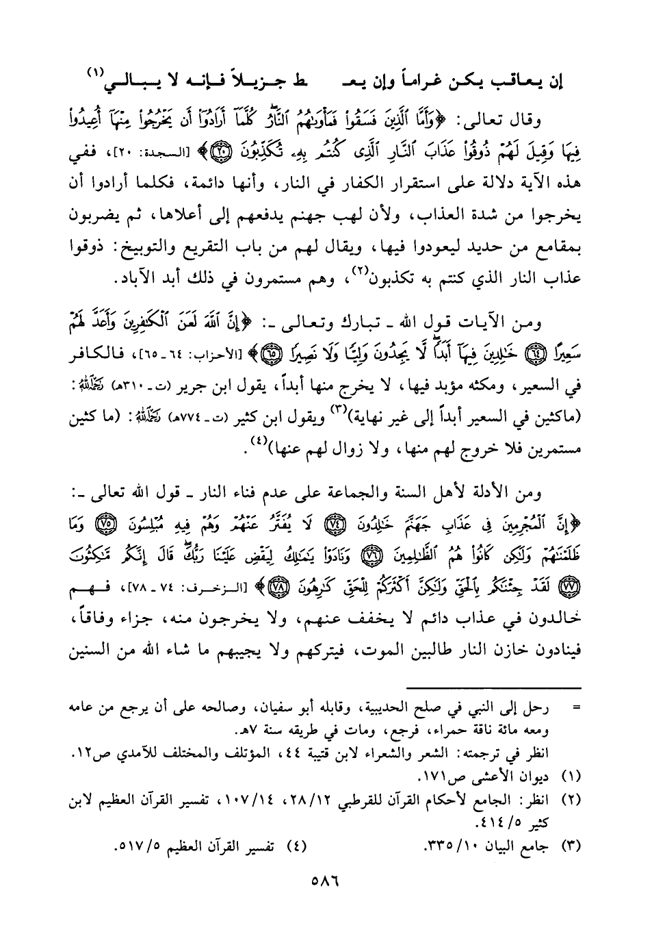 ومن الأدلة لأهل السنة والجماعة على عدم فناء النار - قول الله تعالى -: {إِنَّ الْمُجْرِمِينَ فِي عَذَابِ جَهَنَّمَ خَالِدُونَ * لَا يُفَتَّرُ عَنْهُمْ وَهُمْ فِيهِ مُبْلِسُونَ * وَمَا ظَلَمْنَاهُمْ وَلَكِن كَانُوا هُمُ الظَّالِمِينَ * وَنَادَوْا يَا مَالِكُ لِيَقْضِ عَلَيْنَا رَبُّكَ قَالَ إِنَّكُم مَّاكِثُونَ * لَقَدْ جِئْنَاكُم بِالْحَقِّ وَلَكِنَّ أَكْثَرَكُمْ لِلْحَقِّ كَارِهُونَ} [الزخرف: 74 - 78] ، فهم خالدون في عذاب دائم لا يخفف عنهم، ولا يخرجون منه، جزاء وفاقاً، فينادون خازن النار طالبين الموت، فيتركهم ولا يجيبهم ما شاء الله من السنين