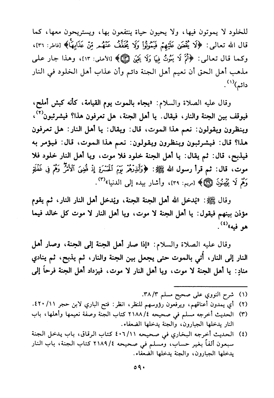 وقال صلّى الله عليه وسلّم: «يُدخل الله أهل الجنة الجنة، ويُدخل أهل النار النار، ثم يقوم مؤذن بينهم فيقول: يا أهل الجنة لا موت، ويا أهل النار لا موت كل خالد فيما هو فيه» (¬4) .