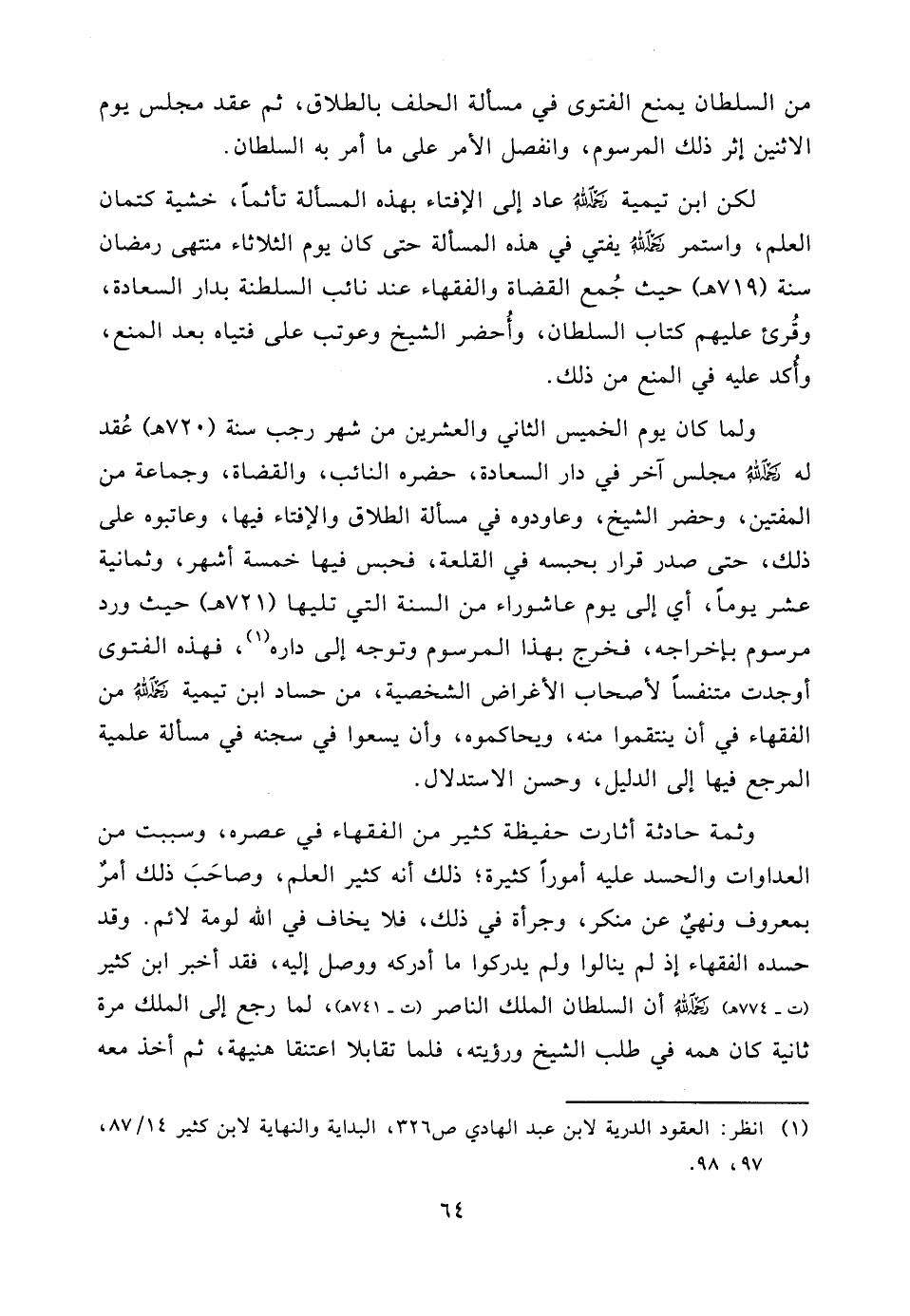 ولما كان يوم الخميس الثاني والعشرين من شهر رجب سنة (720هـ) عُقد له رحمه الله مجلس آخر في دار السعادة، حضره النائب، والقضاة، وجماعة من المفتين، وحضر الشيخ، وعاودوه في مسألة الطلاق والإفتاء فيها، وعاتبوه على ذلك، حتى صدر قرار بحبسه في القلعة، فحبس فيها خمسة أشهر، وثمانية عشر يوماً، أي إلى يوم عاشوراء من السنة التي تليها (721هـ) حيث ورد مرسوم بإخراجه، فخرج بهذا المرسوم وتوجه إلى داره (¬1) ، فهذه الفتوى أوجدت متنفساً لأصحاب الأغراض الشخصية، من حساد ابن تيمية رحمه الله من الفقهاء في أن ينتقموا منه، ويحاكموه، وأن يسعوا في سجنه في مسألة علمية المرجع فيها إلى الدليل، وحسن الاستدلال.