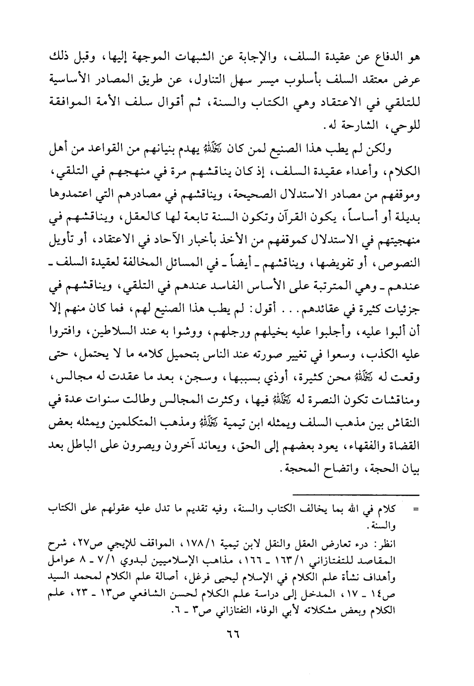 هو الدفاع عن عقيدة السلف، والإجابة عن الشبهات الموجهة إليها، وقبل ذلك عرض معتقد السلف بأسلوب ميسر سهل التناول، عن طريق المصادر الأساسية للتلقي في الاعتقاد وهي الكتاب والسنة، ثم أقوال سلف الأمة الموافقة للوحي، الشارحة له.