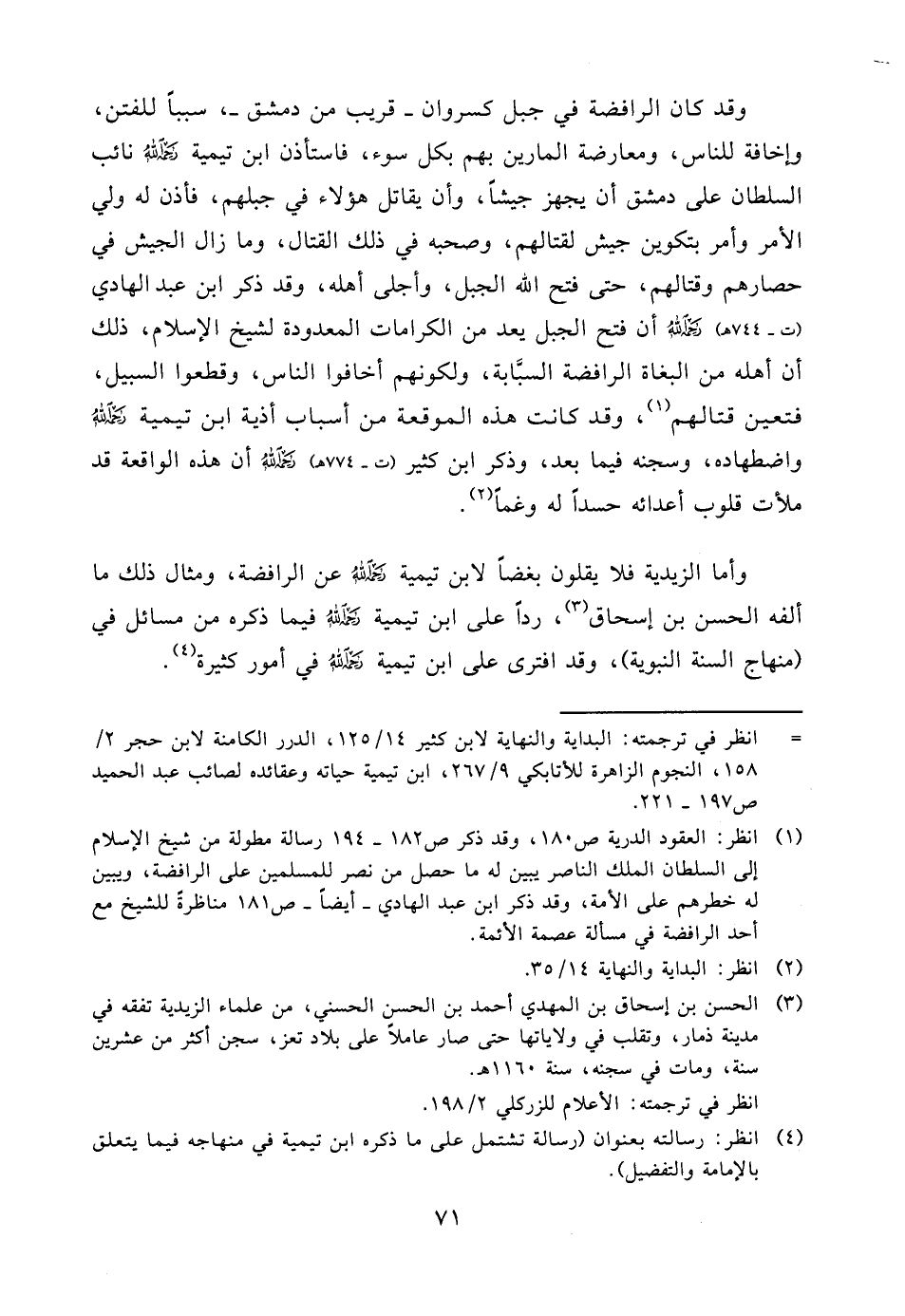 (¬1) انظر: العقود الدرية ص180، وقد ذكر ص182 - 194 رسالة مطولة من شيخ الإسلام إلى السلطان الملك الناصر يبين له ما حصل من نصر للمسلمين على الرافضة، ويبين له خطرهم على الأمة، وقد ذكر ابن عبد الهادي - أيضاً - ص181 مناظرةً للشيخ مع أحد الرافضة في مسألة عصمة الأئمة.