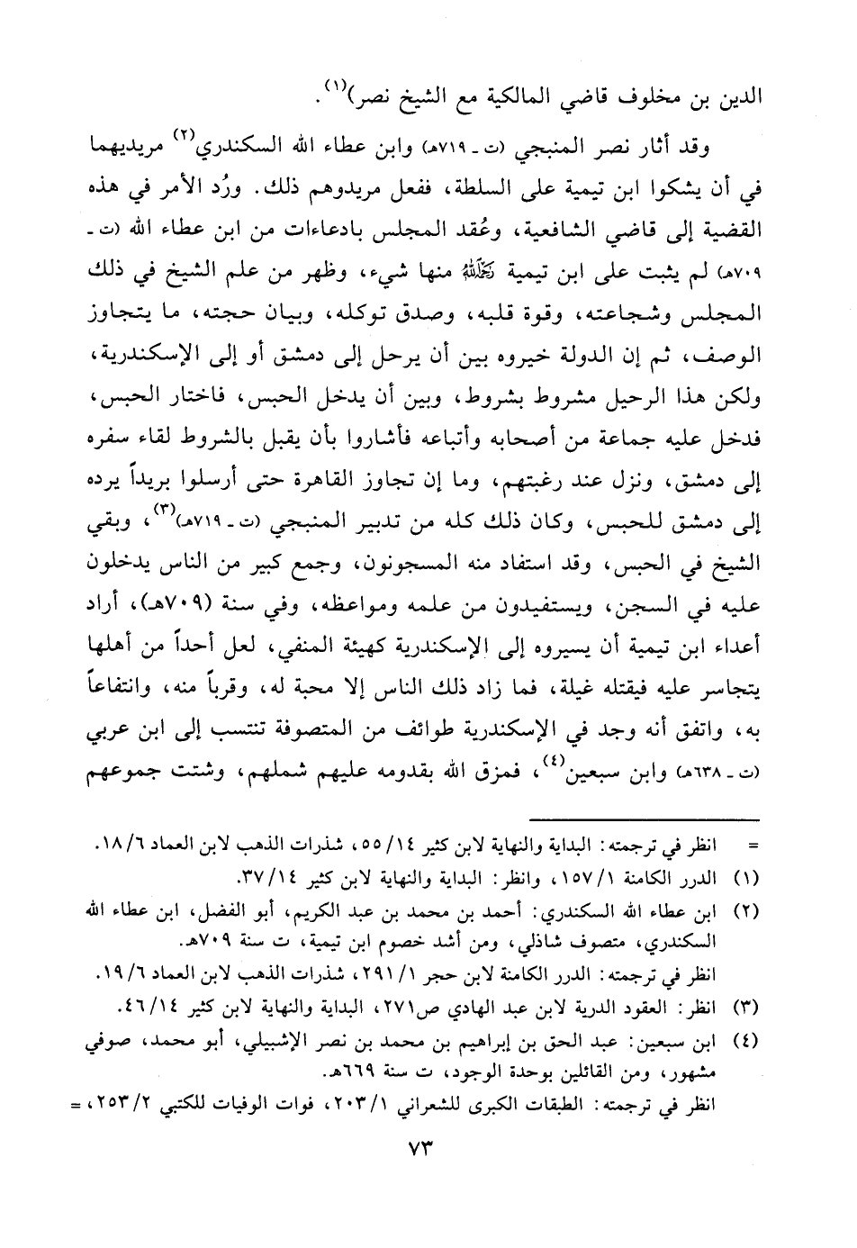 مريديهما في أن يشكوا ابن تيمية على السلطة، ففعل مريدوهم ذلك. ورُد الأمر في هذه القضية إلى قاضي الشافعية، وعُقد المجلس بادعاءات من ابن عطاء الله (ت - 709هـ) لم يثبت على ابن تيمية رحمه الله منها شيء، وظهر من علم الشيخ في ذلك المجلس وشجاعته، وقوة قلبه، وصدق توكله، وبيان حجته، ما يتجاوز الوصف، ثم إن الدولة خيروه بين أن يرحل إلى دمشق أو إلى الإسكندرية، ولكن هذا الرحيل مشروط بشروط، وبين أن يدخل الحبس، فاختار الحبس، فدخل عليه جماعة من أصحابه وأتباعه فأشاروا بأن يقبل بالشروط لقاء سفره إلى دمشق، ونزل عند رغبتهم، وما إن تجاوز القاهرة حتى أرسلوا بريداً يرده إلى دمشق للحبس، وكان ذلك كله من تدبير المنبجي (ت - 719هـ) (¬3) ، وبقي الشيخ في الحبس، وقد استفاد منه المسجونون، وجمع كبير من الناس يدخلون عليه في السجن، ويستفيدون من علمه ومواعظه، وفي سنة (709هـ) ، أراد أعداء ابن تيمية أن يسيروه إلى الإسكندرية كهيئة المنفي، لعل أحداً من أهلها يتجاسر عليه فيقتله غيلة، فما زاد ذلك الناس إلا محبة له، وقرباً منه، وانتفاعاً به، واتفق أنه وجد في الإسكندرية طوائف من المتصوفة تنتسب إلى ابن عربي (ت - 638هـ) وابن سبعين (¬4) ، فمزق الله بقدومه عليهم شملهم، وشتت جموعهم