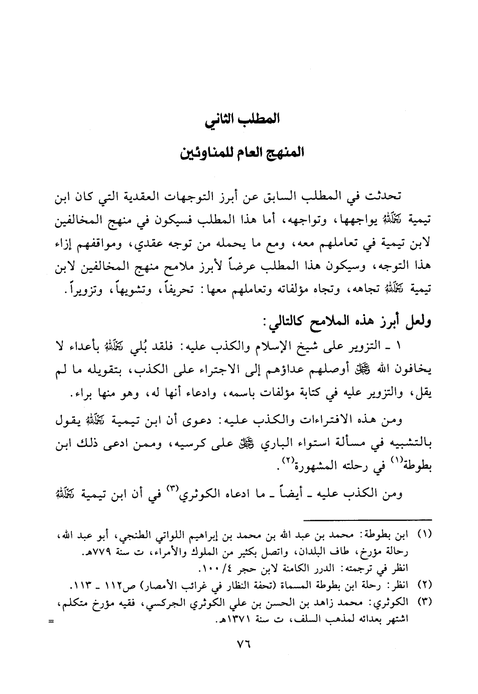 ومن هذه الافتراءات والكذب عليه: دعوى أن ابن تيمية رحمه الله يقول بالتشبيه في مسألة استواء الباري عزّ وجل على كرسيه، وممن ادعى ذلك ابن بطوطة (¬1) في رحلته المشهورة (¬2) .