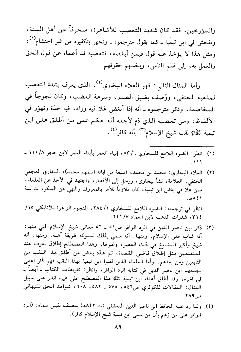 وأما المثال الثاني: فهو العلاء البخاري (¬2) ، الذي يعرف بشدة التعصب لمذهبه الحنفي، ووُصف بضيق الصدر، وسرعة الغضب، وكان لجوجاً في المخاصمة، وذكر مترجموه - أنه إذا أبغض غلا فيه وزاد، فيه حدّة وتهوّر في الألفاظ، ومن تعصبه الذي ذم لأجله أنه حكم على من أطلق على ابن تيمية رحمه الله لقب شيخ الإسلام (¬3) بأنه كافر (¬4) .