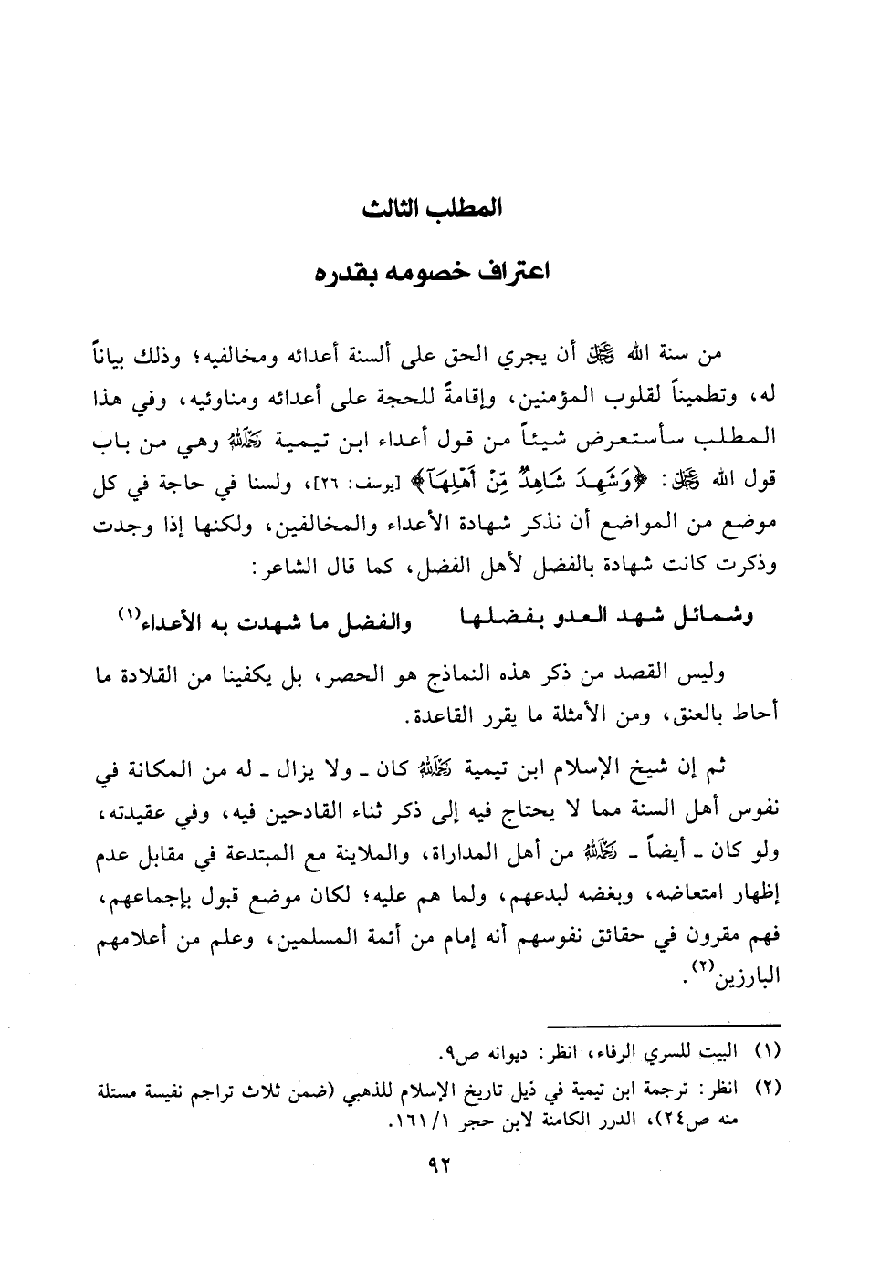 من سنة الله عزّ وجل أن يجري الحق على ألسنة أعدائه ومخالفيه؛ وذلك بياناً له، وتطميناً لقلوب المؤمنين، وإقامةً للحجة على أعدائه ومناوئيه، وفي هذا المطلب سأستعرض شيئاً من قول أعداء ابن تيمية رحمه الله وهي من باب قول الله عزّ وجل: {وَشَهِدَ شَاهِدٌ مِنْ أَهْلِهَا} [يوسف: 26] ، ولسنا في حاجة في كل موضع من المواضع أن نذكر شهادة الأعداء والمخالفين، ولكنها إذا وجدت وذكرت كانت شهادة بالفضل لأهل الفضل، كما قال الشاعر: