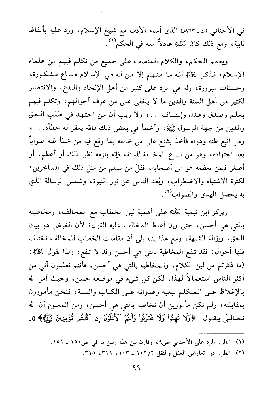 ويعمم الحكم، والكلام المنصف على جميع من تكلم فيهم من علماء الإسلام، فذكر رحمه الله أنه ما منهم إلا من له في الإسلام مساع مشكورة، وحسنات مبرورة، وله في الرد على كثير من أهل الإلحاد والبدع، والانتصار لكثير من أهل السنة والدين ما لا يخفى على من عرف أحوالهم، وتكلم فيهم بعلم وصدق وعدل وإنصاف ... ، ولا ريب أن من اجتهد في طلب الحق والدين من جهة الرسول صلّى الله عليه وسلّم، وأخطأ في بعض ذلك فالله يغفر له خطأه ... ، ومن اتبع ظنه وهواه فأخذ يشنع على من خالفه بما وقع فيه من خطأ ظنه صواباً بعد اجتهاده، وهو من البدع المخالفة للسنة، فإنه يلزمه نظير ذلك أو أعظم، أو أصغر فيمن يعظمه هو من أصحابه، فقلّ من يسلم من مثل ذلك في المتأخرين؛ لكثرة الاشتباه والاضطراب، وبُعد الناس عن نور النبوة، وشمس الرسالة الذي به يحصل الهدى والصواب (¬2) .