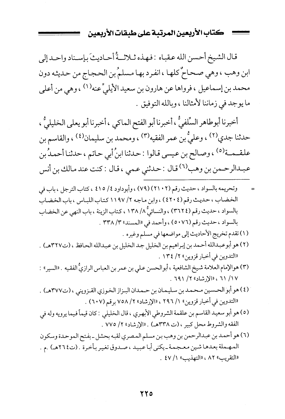 قال الشيخ أحسن الله عقباه: فهذه ثلاثة أحاديث بإسناد واحد إلى ابن وهب، وهي صحاحٌ كلها، انفرد بها مسلم بن الحجاج من حديثه دون محمد بن إسماعيل، فرواها عن هارون بن سعيد الأيلي عنه، وهي من أعلى ما يوجد في زماننا لأمثالنا، وبالله التوفيق.