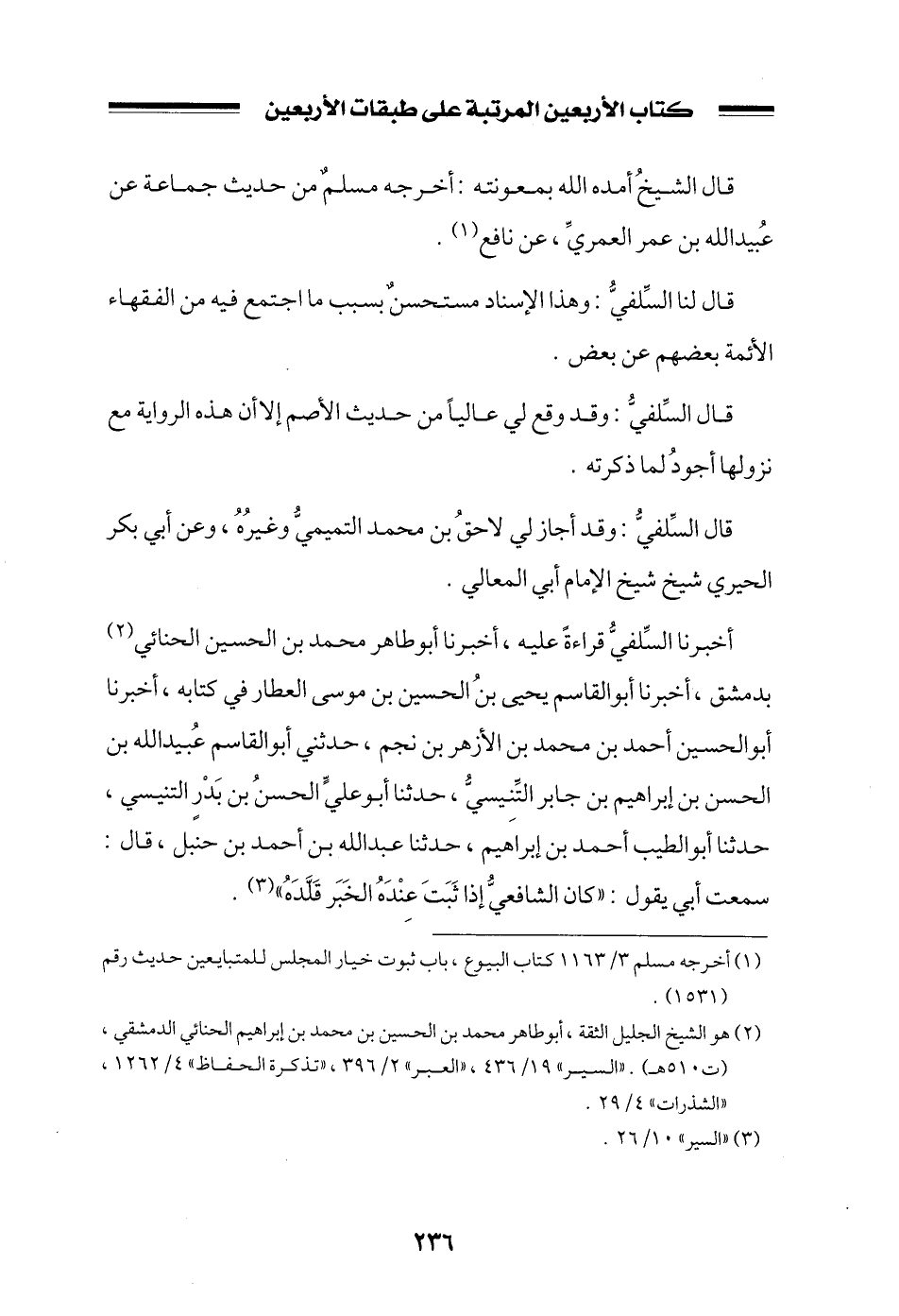قال لنا السلفي: وهذا الإسناد مستحسنٌ بسبب ما اجتمع فيه من الفقهاء الأئمة بعضهم على بعض.