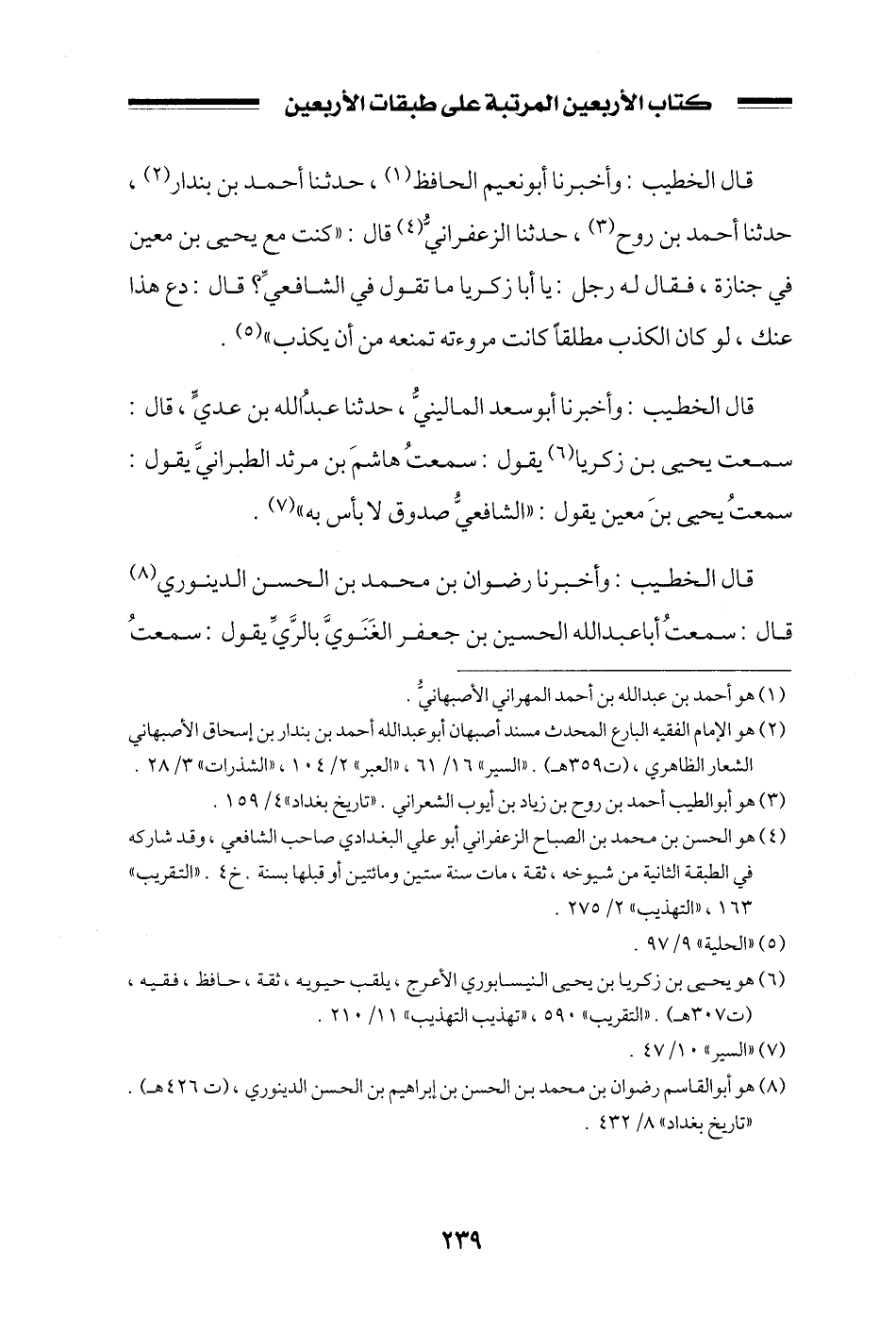 قال الخطيب: وأخبرنا أبو نعيم الحافظ، حدثنا أحمد بن بندار، حدثنا أحمد بن روح، حدثنا الزعفراني قال: ((كنت مع يحيى بن معين في جنازة، فقال له رجل: يا أبا زكريا ما تقول في الشافعي؟ قال: دع هذا عنك، لو كان الكذب مطلقاً كانت مروءته تمنعه من أن يكذب)) .