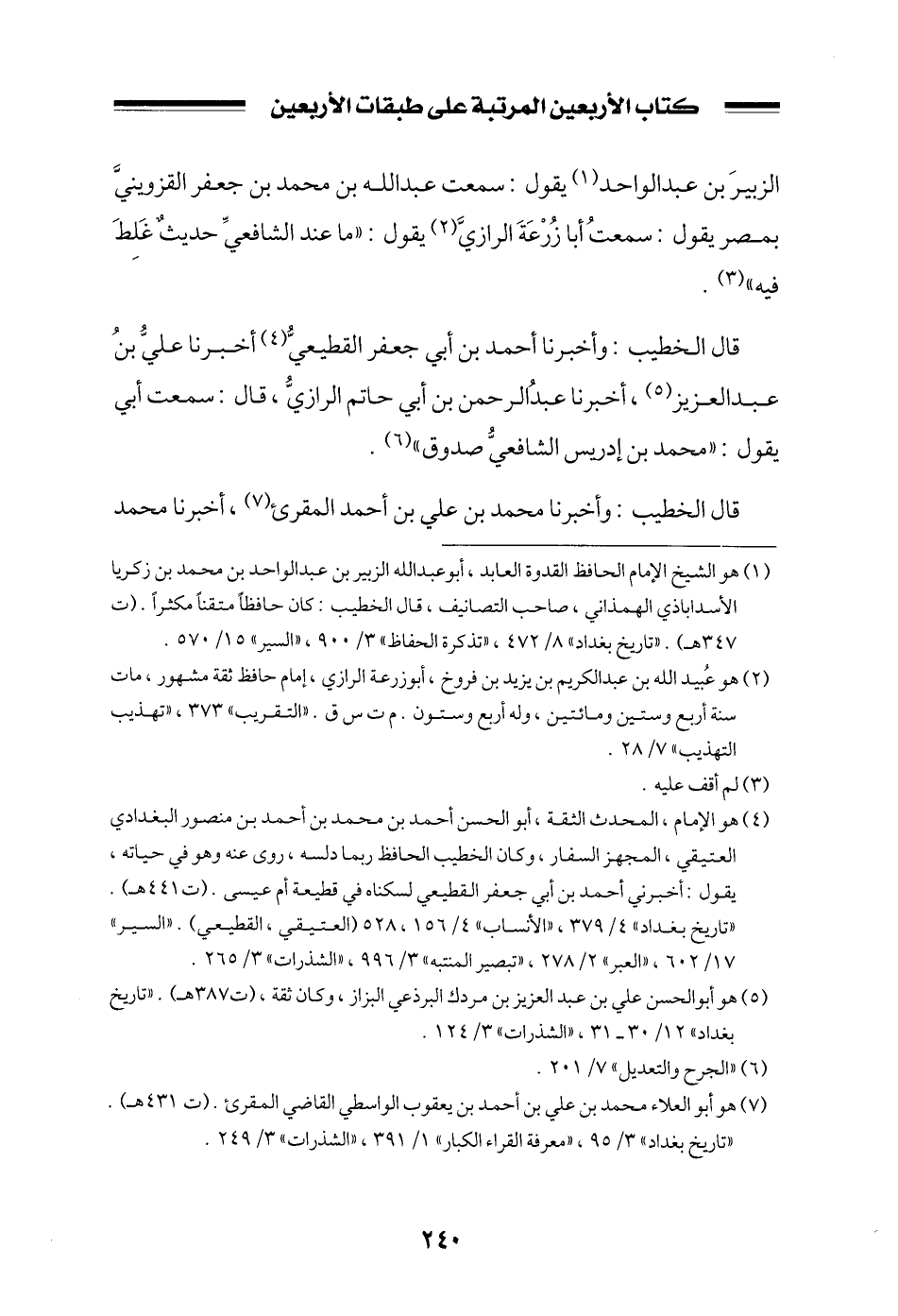 الزبير بن عبد الواحد يقول: سمعت عبد الله بن محمد بن جعفر القزويني بمصر يقول: سمعت أبا زرعة الرازي يقول: ((ما عند الشافعي حديثٌ غلط فيه)) .