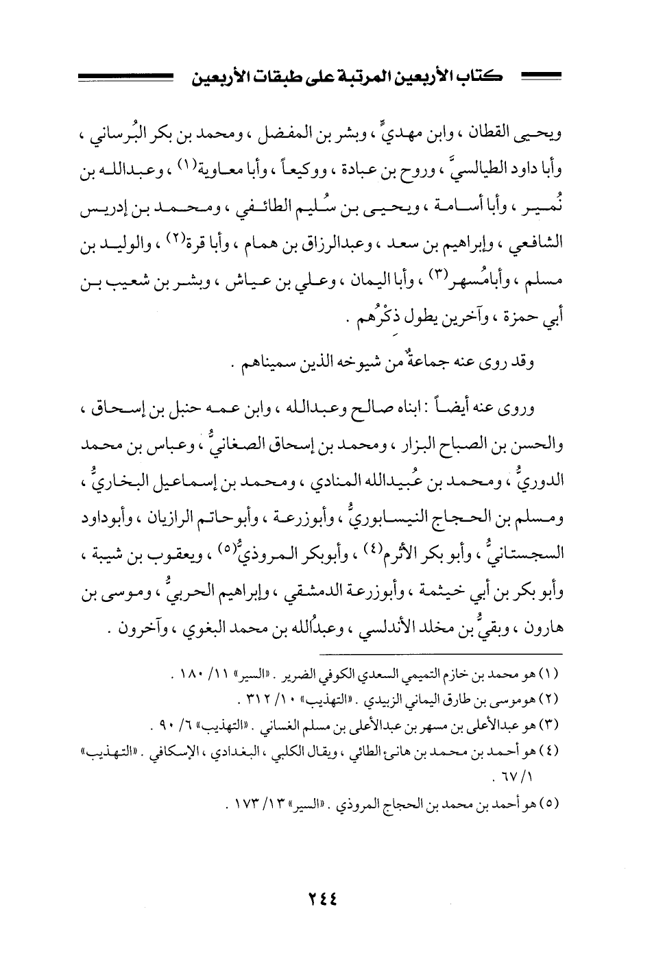 وروى عنه أيضاً: ابناه صالح وعبد الله، وابن عمه حنبل بن إسحاق، والحسن بن الصباح البزار، ومحمد بن إسحاق الصغاني، وعباس بن محمد الدوري، ومحمد بن عبيد الله المنادي، ومحمد بن إسماعيل البخاري، ومسلم بن الحجاج النيسابوري، وأبو زرعة، وأبو حاتم الرازيان، وأبو داود السجستاني، وأبو بكر الأثرم، وأبو بكر المروذي، ويعقوب بن شيبة، وأبو بكر بن أبي خيثمة، وأبو زرعة الدمشقي، وإبراهيم الحربي، وموسى بن هارون، وبقي بن مخلد الأندلسي، وعبد الله بن محمد البغوي، وآخرون.