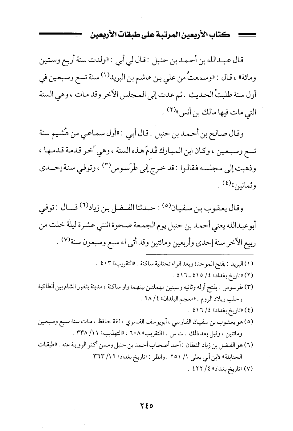 وقال صالح بن أحمد بن حنبل: قال أبي: ((أول سماعي من هشيم سنة تسع وسبعين، وكان ابن المبارك قدم هذه السنة، وهي آخر قدمة قدمها، وذهبت إلى مجلسه فقالوا: قد خرج إلى طرسوس، وتوفي سنة إحدى وثمانين)) .