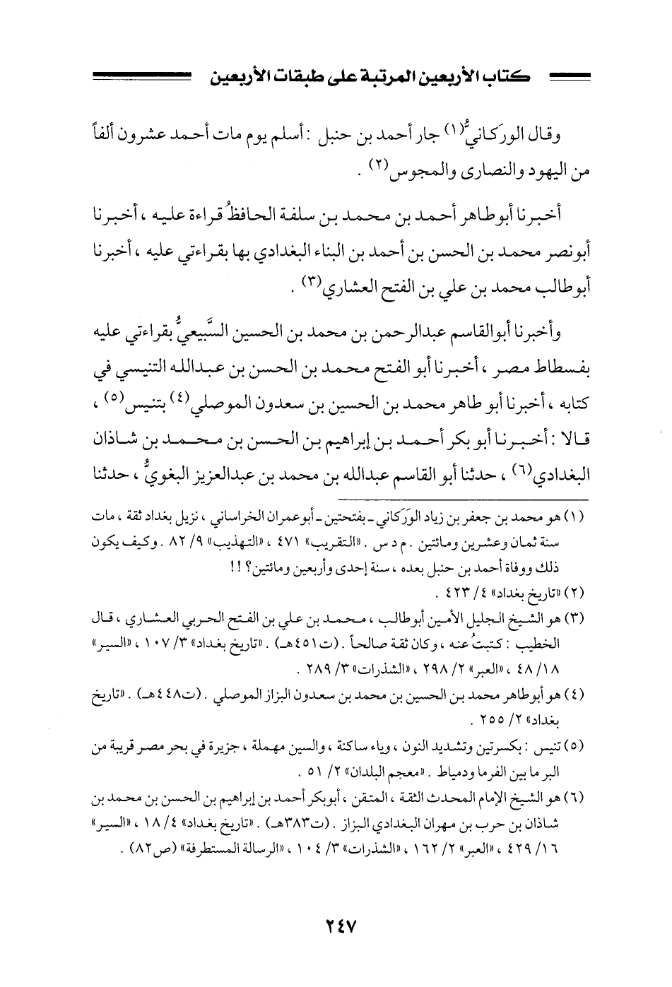 وأخبرنا أبو القاسم عبد الرحمن بن محمد بن الحسين السبيعي بقراءتي عليه بفسطاط مصر، أخبرنا أبو الفتح محمد بن الحسن بن عبد الله التنيسي في كتابه، أخبرنا أبو طاهر محمد بن الحسين بن سعدون الموصلي بتنيس، قالا: أخبرنا أبو بكر أحمد بن إبراهيم بن الحسن بن محمد بن شاذان البغدادي، حدثنا أبو القاسم عبد الله بن محمد بن عبد العزيز البغوي، حدثنا