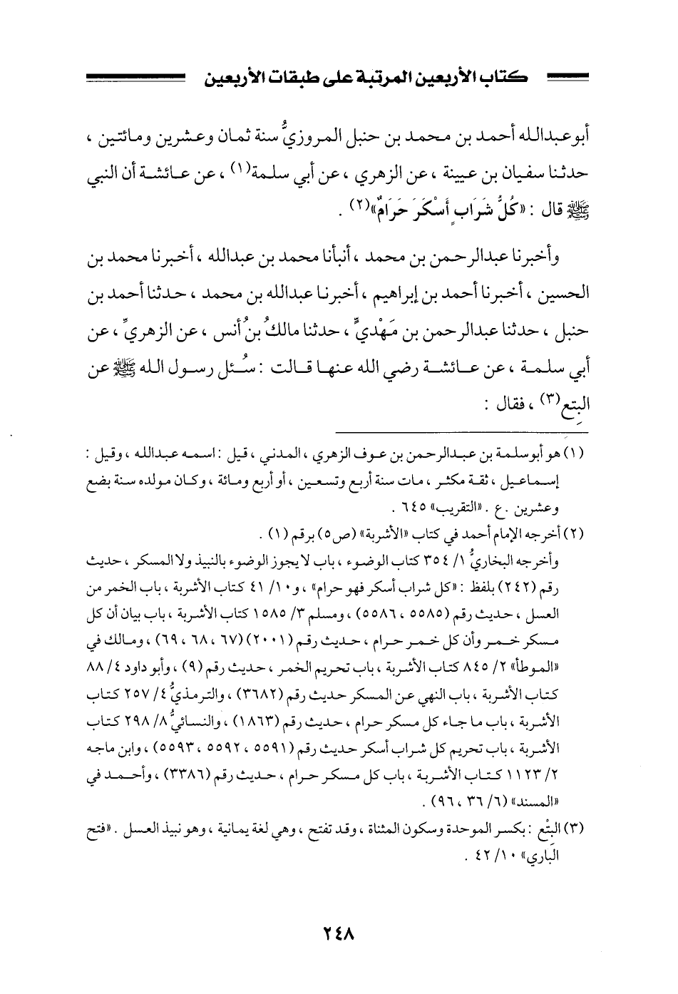 أبو عبد الله أحمد بن محمد بن حنبل المروزي سنة ثمان وعشرين ومائتين، حدثنا سفيان بن عيينة، عن الزهري، عن أبي سلمة، عن عائشة أن النبي صلى الله عليه وسلم قال: ((كل شرابٍ أسكر حرامٌ)) .