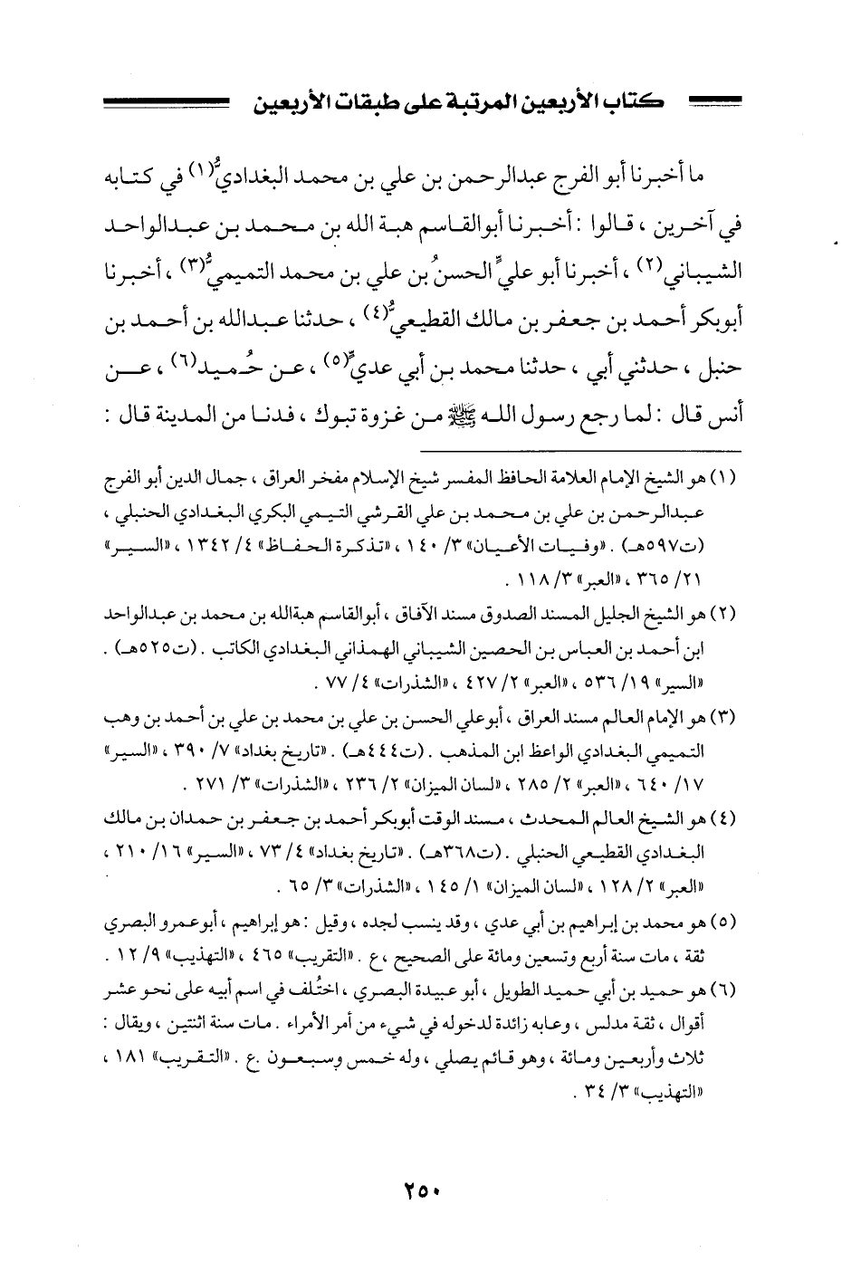 ما أخبرنا أبو الفرج عبد الرحمن بن علي بن محمد البغدادي في كتابه في آخرين، قالوا: أخبرنا أبو القاسم هبة الله بن محمد بن عبد الواحد الشيباني، أخبرنا أبو علي الحسن بن علي بن محمد التميمي، أخبرنا أبو بكر أحمد بن جعفر بن مالك القطيعي، حدثنا عبد الله بن أحمد بن حنبل، حدثني أبي، حدثنا محمد بن أبي عدي، عن حميد، عن أنس قال: لما رجع رسول الله صلى الله عليه وسلم من غزوة تبوك، فدنا من المدينة قال: