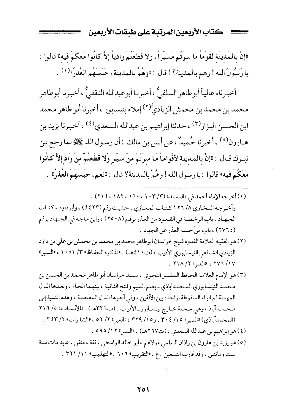 أخبرناه عالياً أبو طاهر السلفي، أخبرنا أبو عبد الله الثقفي، أخبرنا أبو طاهر محمد بن محمد بن محمش الزيادي إملاء بنيسابور، أخبرنا أبو طاهر محمد ابن الحسن البزاز، حدثنا إبراهيم بن عبد الله السعدي، أخبرنا يزيد بن هارون، أخبرنا حميدٌ عن أنس بن مالك: أن رسول الله صلى الله عليه وسلم لما رجع من تبوك قال: ((إن بالمدينة لأقواماً ما سرتم من سيرٍ ولا قطعتم من وادٍ إلا كانوا معكم فيه)) قالوا: يا رسول الله! وهم بالمدينة؟ قال: ((نعم، حبسهم العذر)) .