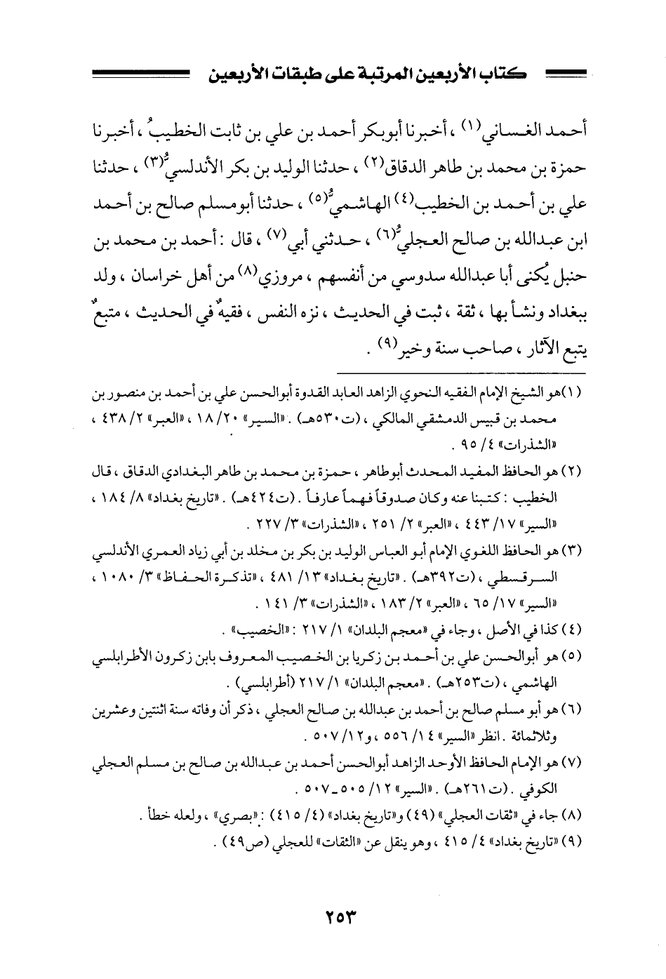 أحمد الغساني، أخبرنا أبو بكر أحمد بن علي بن ثابت الخطيب، أخبرنا حمزة بن محمد بن طاهر الدقاق، حدثنا الوليد بن بكر الأندلسي، حدثنا علي بن أحمد بن الخطيب الهاشمي، حدثنا أبو مسلم صالح بن أحمد ابن عبد الله بن صالح العجلي، حدثني أبي، قال: أحمد بن محمد بن حنبل يكنى أبا عبد الله سدوسي من أنفسهم، مروزي من أهل خراسان، ولد ببغداد ونشأ بها، ثقة، ثبت في الحديث نزه النفس، فقيهٌ في الحديث، متبعٌ يتبع الآثار، صاحب سنة وخير.