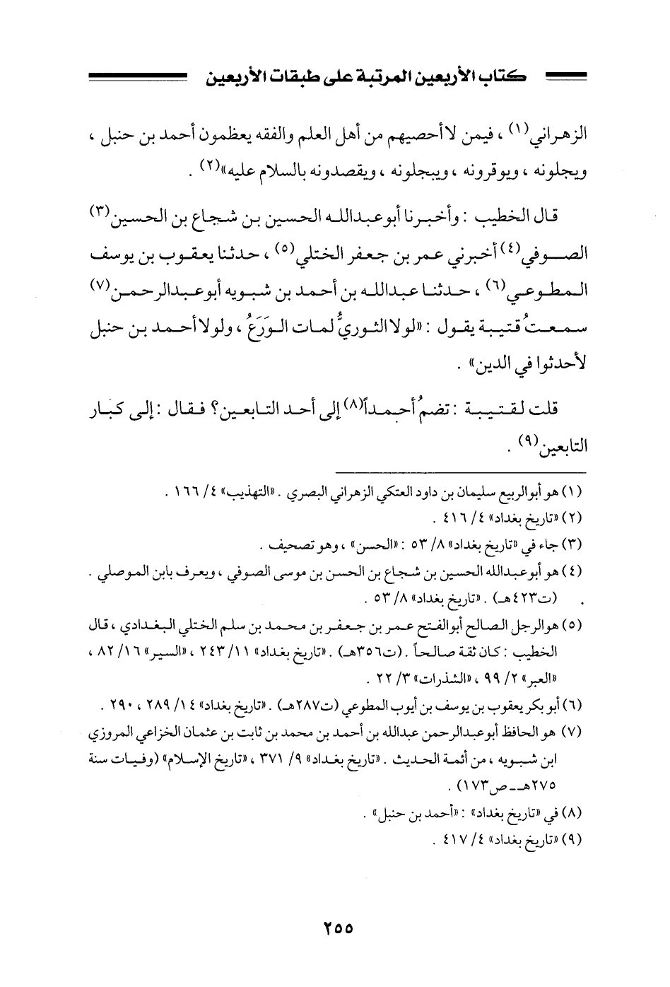 الزهراني، فيمن لا أحصيهم من أهل العلم والفقه يعظمون أحمد بن حنبل، ويجلونه، ويوقرونه، ويبجلونه، ويقصدونه بالسلام عليه)) .