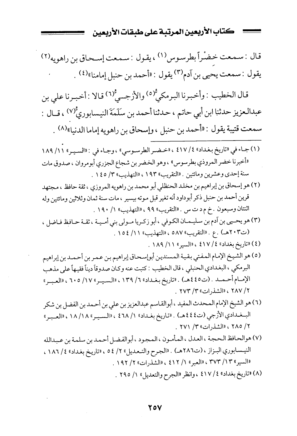 قال: سمعت خضراً بطرسوس، يقول: سمعت إسحاق بن راهويه يقول: سمعت يحيى بن آدم يقول: ((أحمد بن حنبل إمامنا)) .
