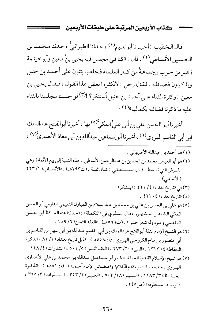 قال الخطيب: أخبرنا أبو نعيم، حدثنا الطبراني، حدثنا محمد بن الحسين الأنماطي، قال: ((كنا في مجلس فيه يحيى بن معين وأبو خيثمة زهير بن حرب وجماعةٌ من كبار العلماء فجعلوا يثنون على أحمد بن حنبل ويذكرون فضائله. فقال رجل: لا تكثروا بعض هذا القول، فقال يحيى بن معين: وكثرة الثناء على أحمد بن حنبل تستنكر؟! لو جلسنا مجلسنا بالثناء عليه ما ذكرنا فضائله بكمالها)) .