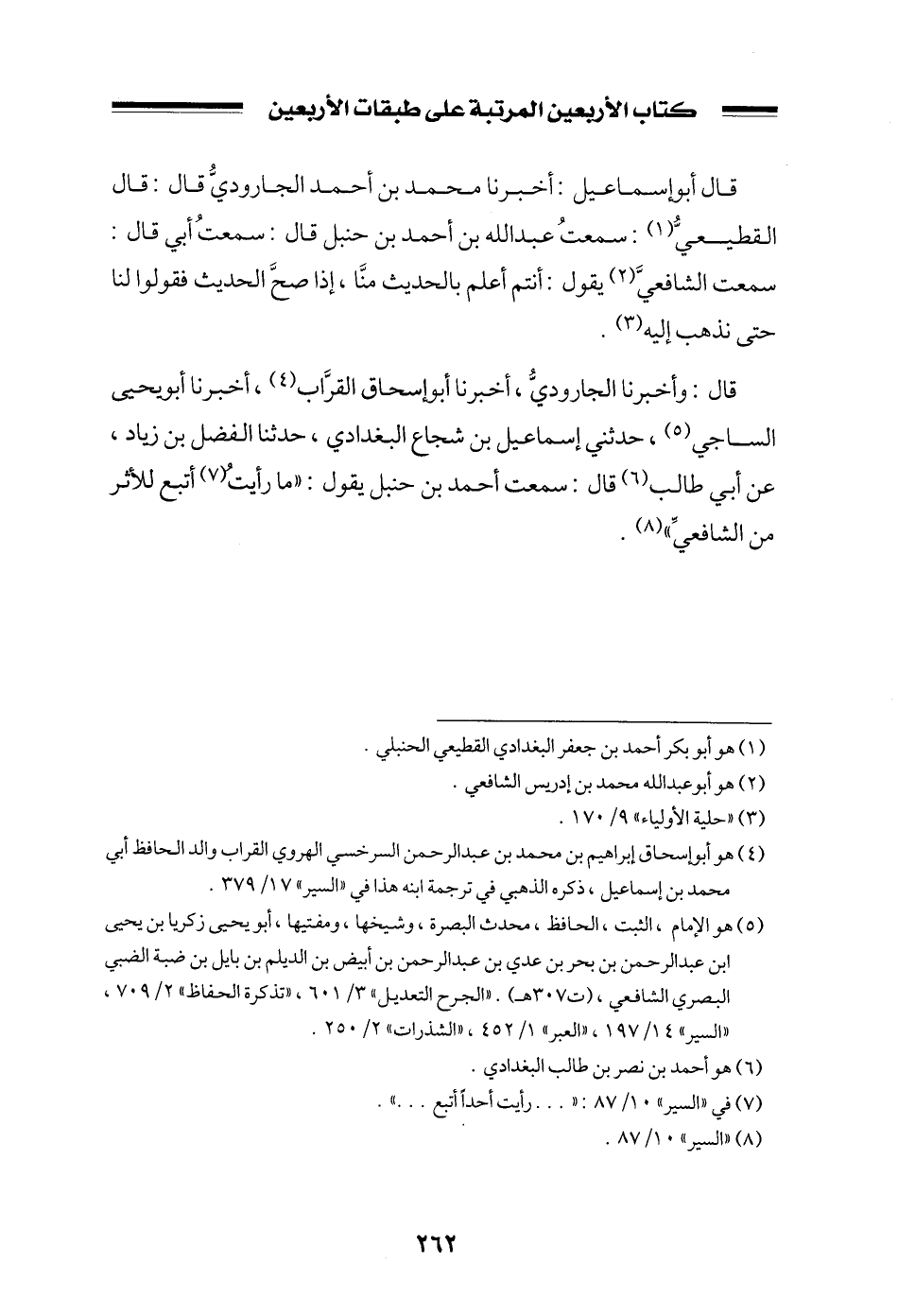 قال أبو إسماعيل: أخبرنا محمد بن أحمد الجارودي قال: قال القطيعي: سمعت عبد الله بن أحمد بن حنبل قال: سمعت أبي قال: سمعت الشافعي يقول: أنتم أعلم بالحديث منا، إذا صح الحديث فقولوا لنا حتى نذهب إليه.