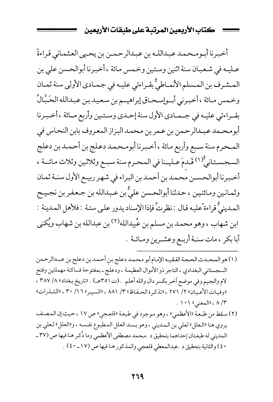 أخبرنا أبو محمد عبد الله بن عبد الرحمن بن يحيى العثماني قراءةً عليه في شعبان سنة اثنين وستين وخمس مائة، أخبرنا أبو الحسن علي بن المشرف بن المسلم الأنماطي بقراءتي عليه في جمادى الأولى سنة ثمان وخمس مائة، أخبرني أبو إسحاق إبراهيم بن سعيد بن عبد الله الحبال بقراءتي عليه في جمادى الأولى سنة إحدى وستين وأربع مائة، أخبرنا أبو محمد عبد الرحمن بن عمر بن محمد البزاز المعروف بابن النحاس في المحرم سنة سبع وأربع مائة، أخبرنا أبو محمد دعلج بن أحمد بن دعلج السجستاني، قدم علينا في المحرم سنة سبع وثلاثين وثلاث مائة، أخبرنا أبو الحسن محمد بن أحمد بن البراء في شهر ربيع الأول سنة ثمان وثمانين ومائتين، حدثنا أبو الحسن علي بن عبد الله بن جعفر بن نجيح المديني قراءةً عليه قال: نظرت فإذا الإسناد يدور على ستة: فلأهل المدينة: ابن شهاب، وهو محمد بن مسلم بن عبيد الله بن عبد الله بن شهاب ويكنى أبا بكر، مات سنة أربع وعشرين ومائة.