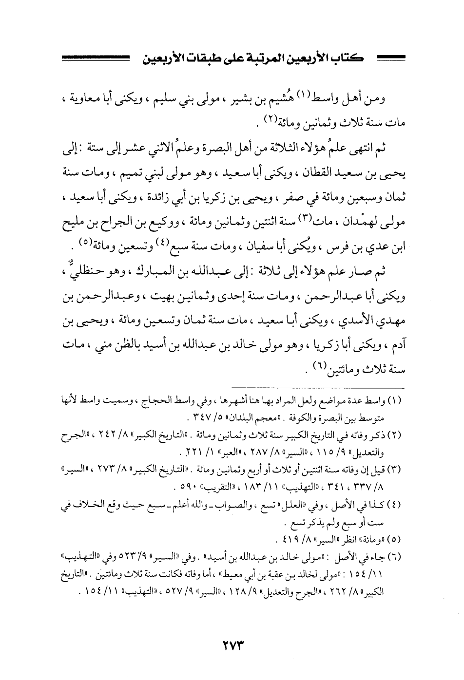 ثم انتهى علم هؤلاء الثلاثة من أهل البصرة وعلم الاثني عشر إلى ستة: إلى يحيى بن سعيد القطان، ويكنى أبا سعيد، وهو مولى لبني تميم، ومات سنة ثمان وسبعين ومائة في صفر، ويحيى بن زكريا بن أبي زائدة، ويكنى أبا سعيد، مولى لهمدان، مات سنة اثنتين وثمانين ومائة، ووكيع بن الجراح بن مليح ابن عدي بن فرس، ويكنى أبا سفيان، ومات سنة سبع وتسعين ومائة.